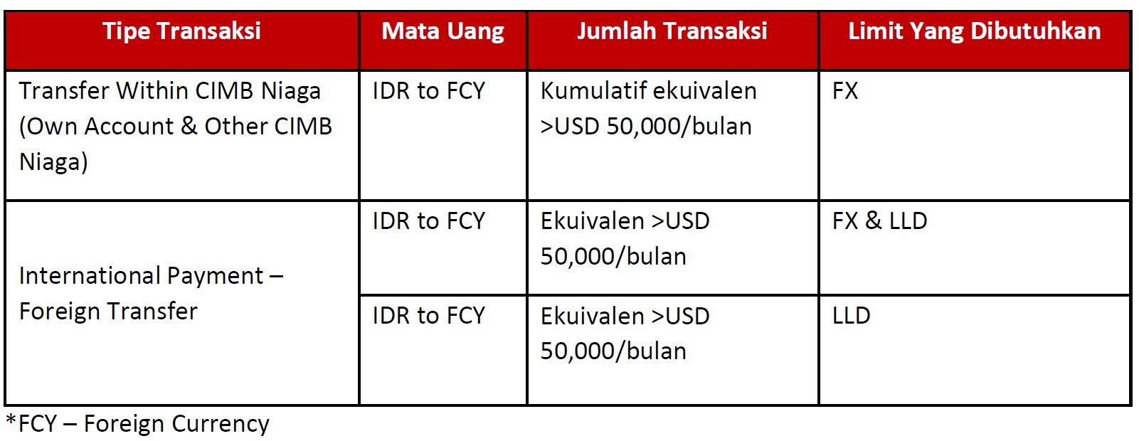 | 5 | Apakah limit FX dan LLD terpisah? | Ya, limit FX dan LLD terpisah, dan akan terpakai sesuai penggunaannya. Jika hanya bertransaksi FX, maka hanya limit FX yang akan terpakai, dan sebaliknya. |