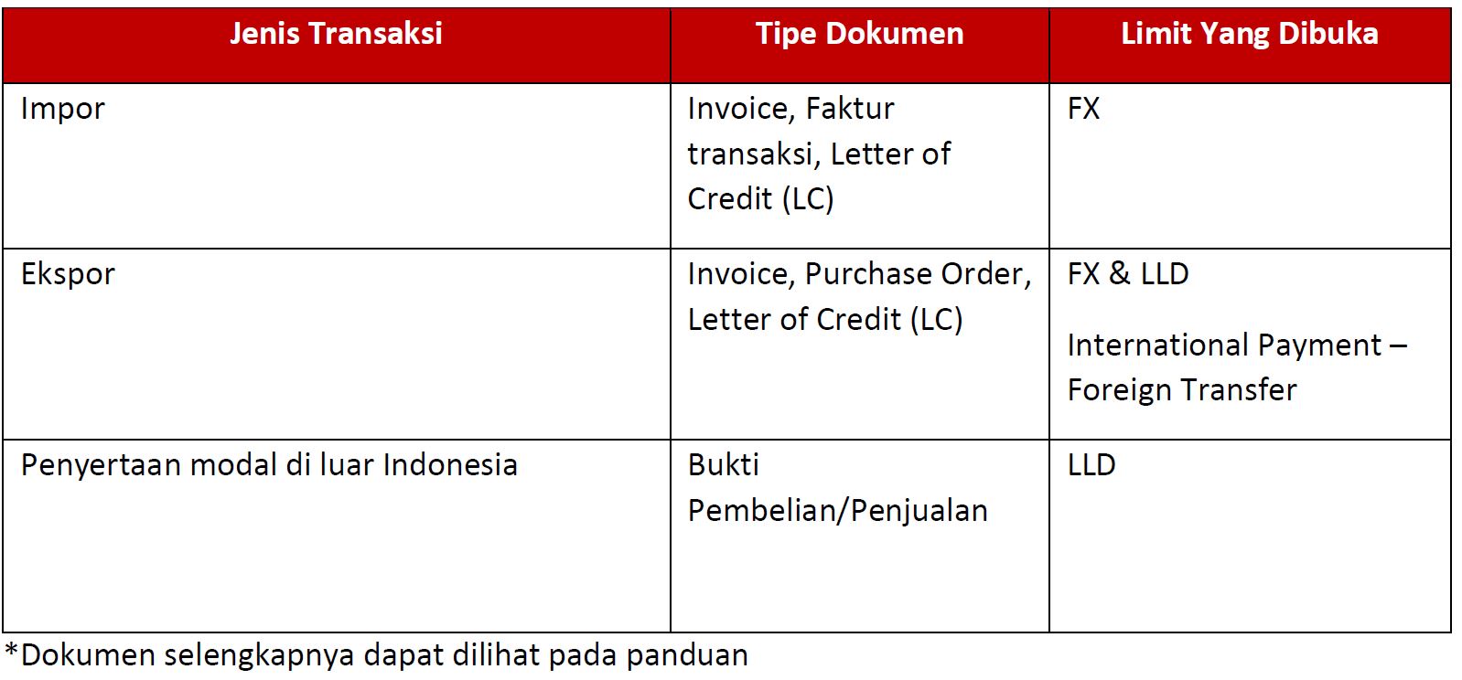 Ketentuan penggunaan dokumen underlying untuk ke dua jenis transaksi tersebut dapat mengikuti tabel berikut ini: |