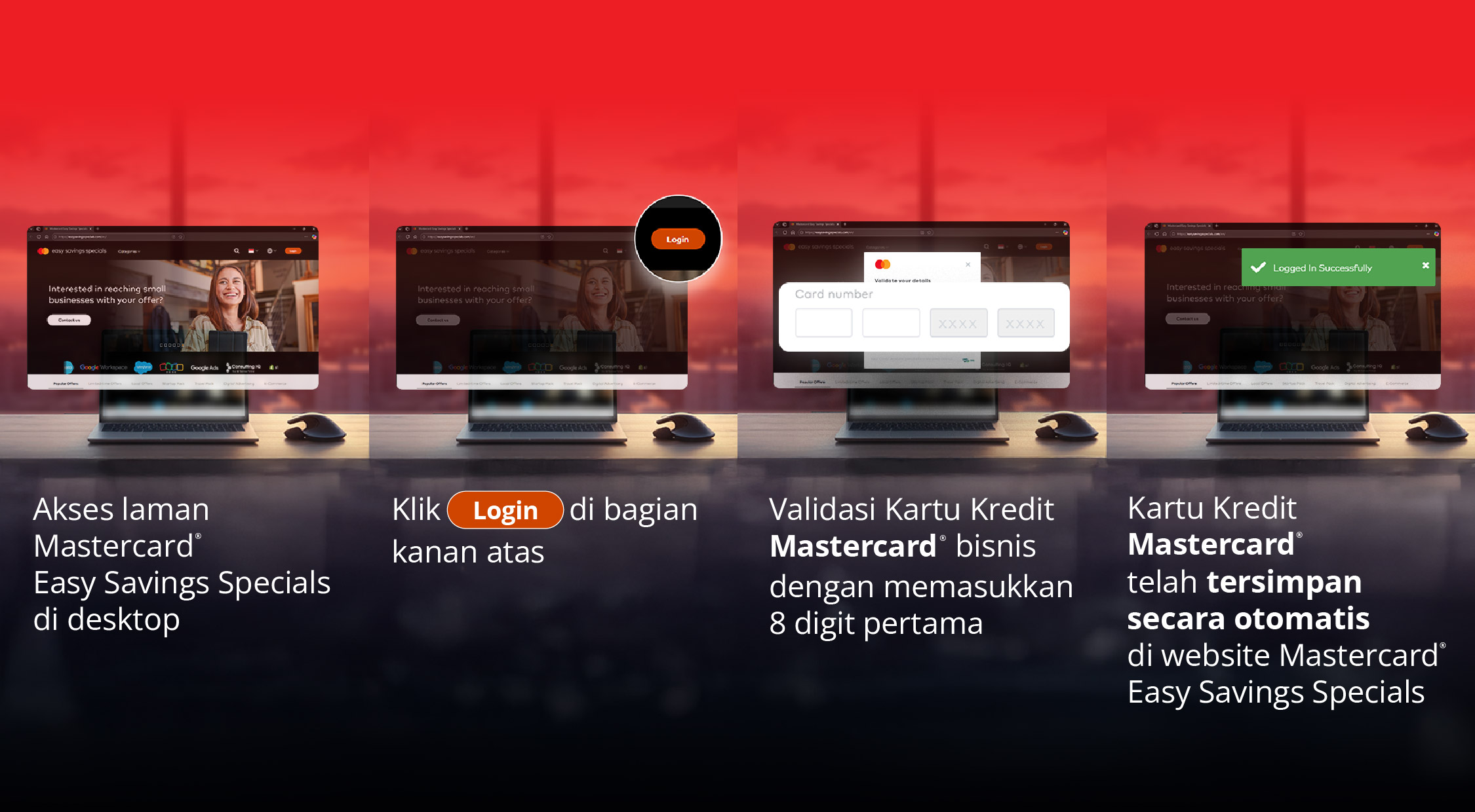 Mastercard® Easy Savings Specials merupakan program yang diberikan kepada Pengguna Kartu Kredit Mastercard® bisnis (kartu fisik & virtual card/VCN) yang memenuhi syarat untuk mendapatkan potongan harga atas pembelian yang dilakukan dari Merchant yang berpartisipasi. Program Mastercard® Easy Savings Specials tersebut tidak berlaku untuk Pengguna Kartu Kredit Pribadi dan Kartu Debit Pribadi.