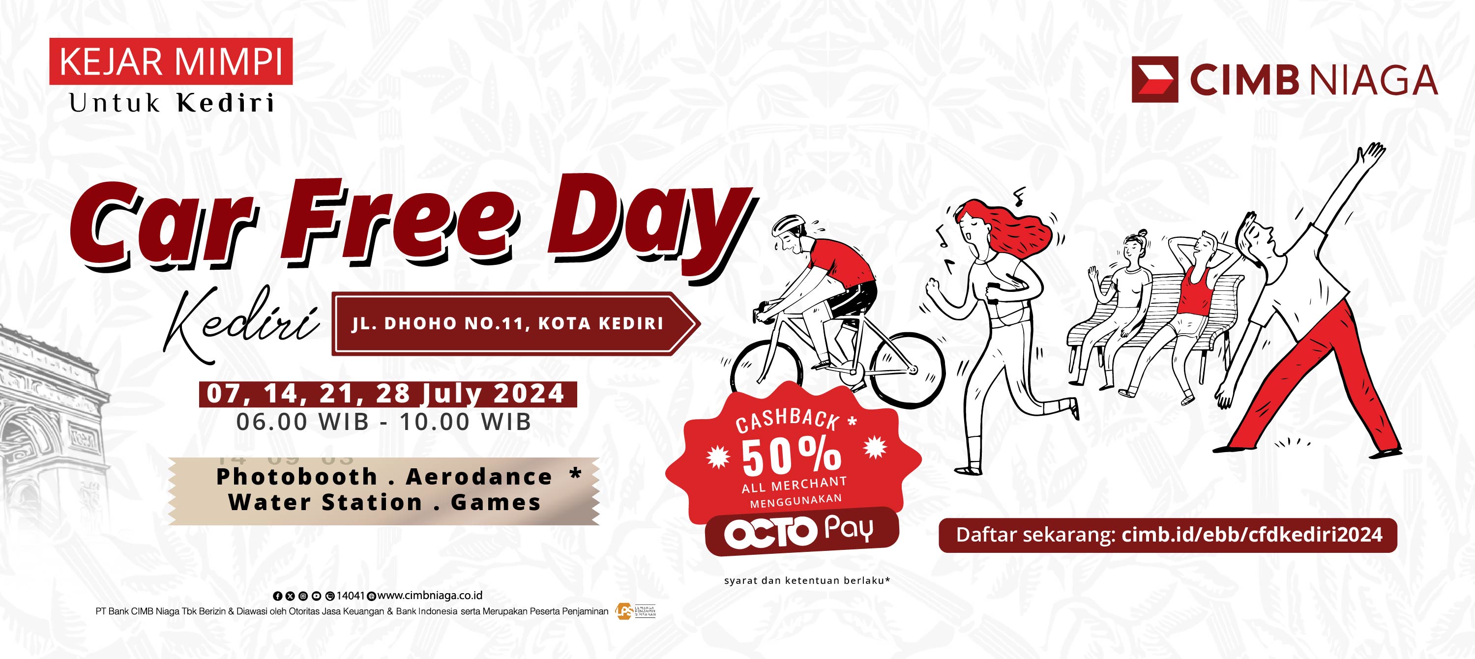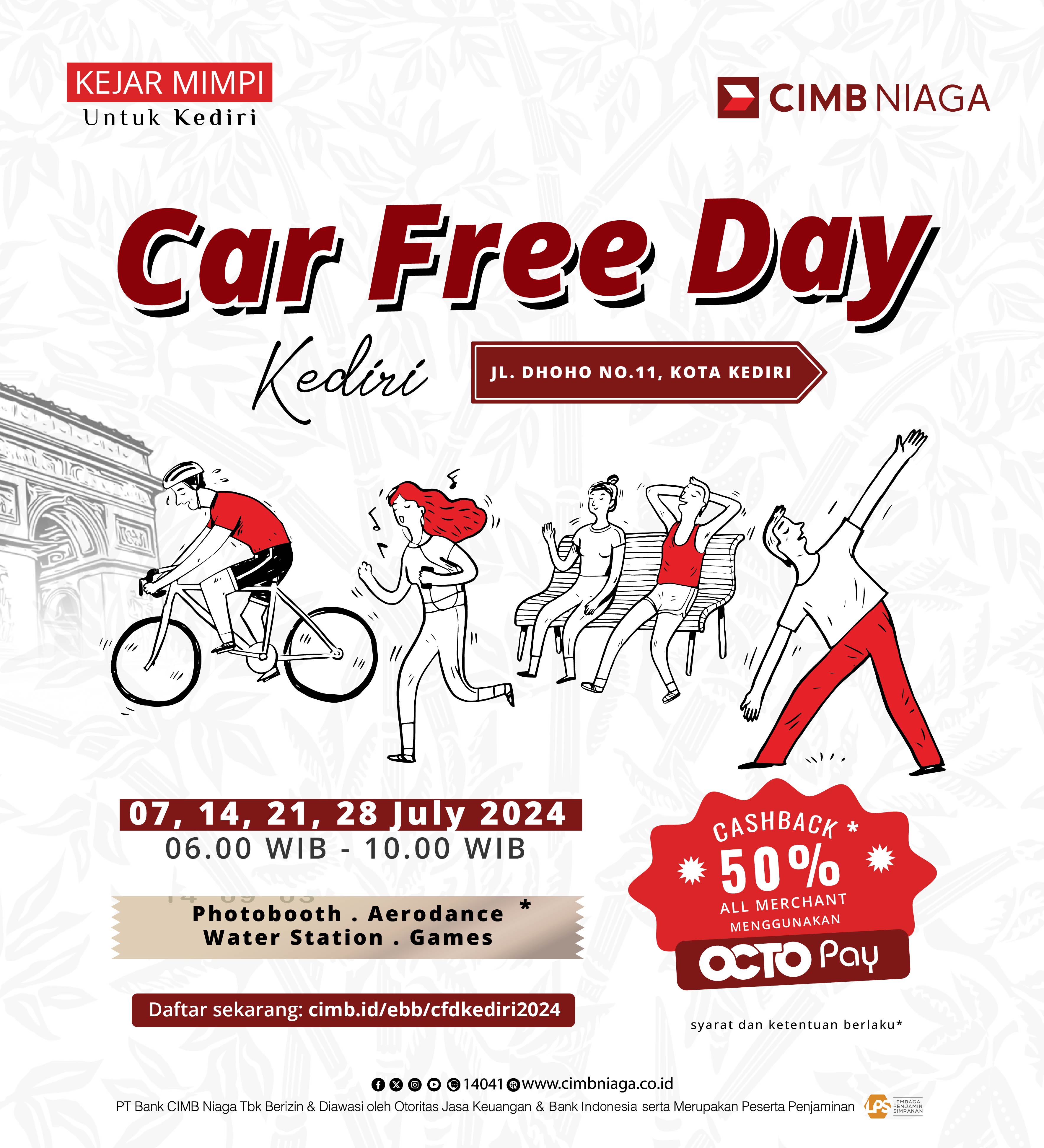 Dalam upaya menciptakan gaya hidup sehat, lingkungan bersih, dan memberdayakan UMKM, CIMB Niaga menyelenggarakan Car Free Day Kediri setiap hari Minggu pada tanggal 7, 14, 21, dan 28 Juli 2024. Acara ini memberikan kesempatan kepada masyarakat untuk menikmati udara segar tanpa polusi kendaraan bermotor dan sekaligus mendukung UMKM lokal. Melalui program Cashback 50% Merchant dan berbagai kegiatan seru, CIMB Niaga memastikan visibilitas dan peningkatan penjualan bagi UMKM yang berpartisipasi.