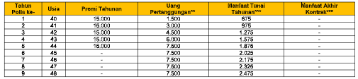 | Tahun Polis ke- | Usia | Premi Tahunan | Uang Pertanggungan** | Manfaat Tunai Tahunan*** | Manfaat Akhir Kontrak*** |