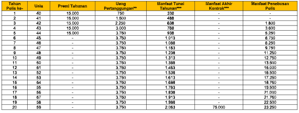 | Tahun Polis ke- | Usia | Premi Tahunan | Uang Pertanggungan** | Manfaat Tunai Tahunan*** | Manfaat Akhir Kontrak*** | Manfaat Penebusan Polis |