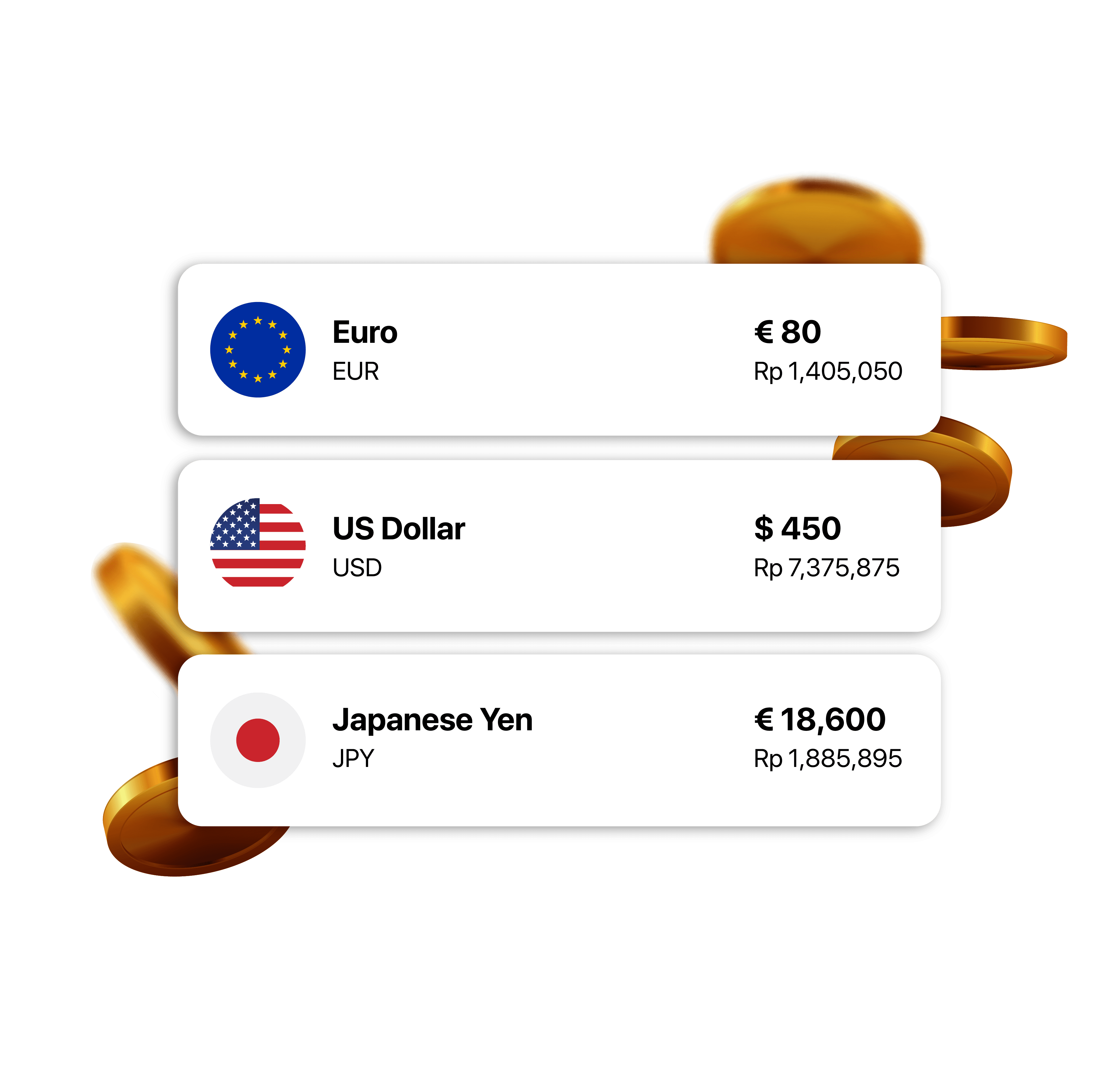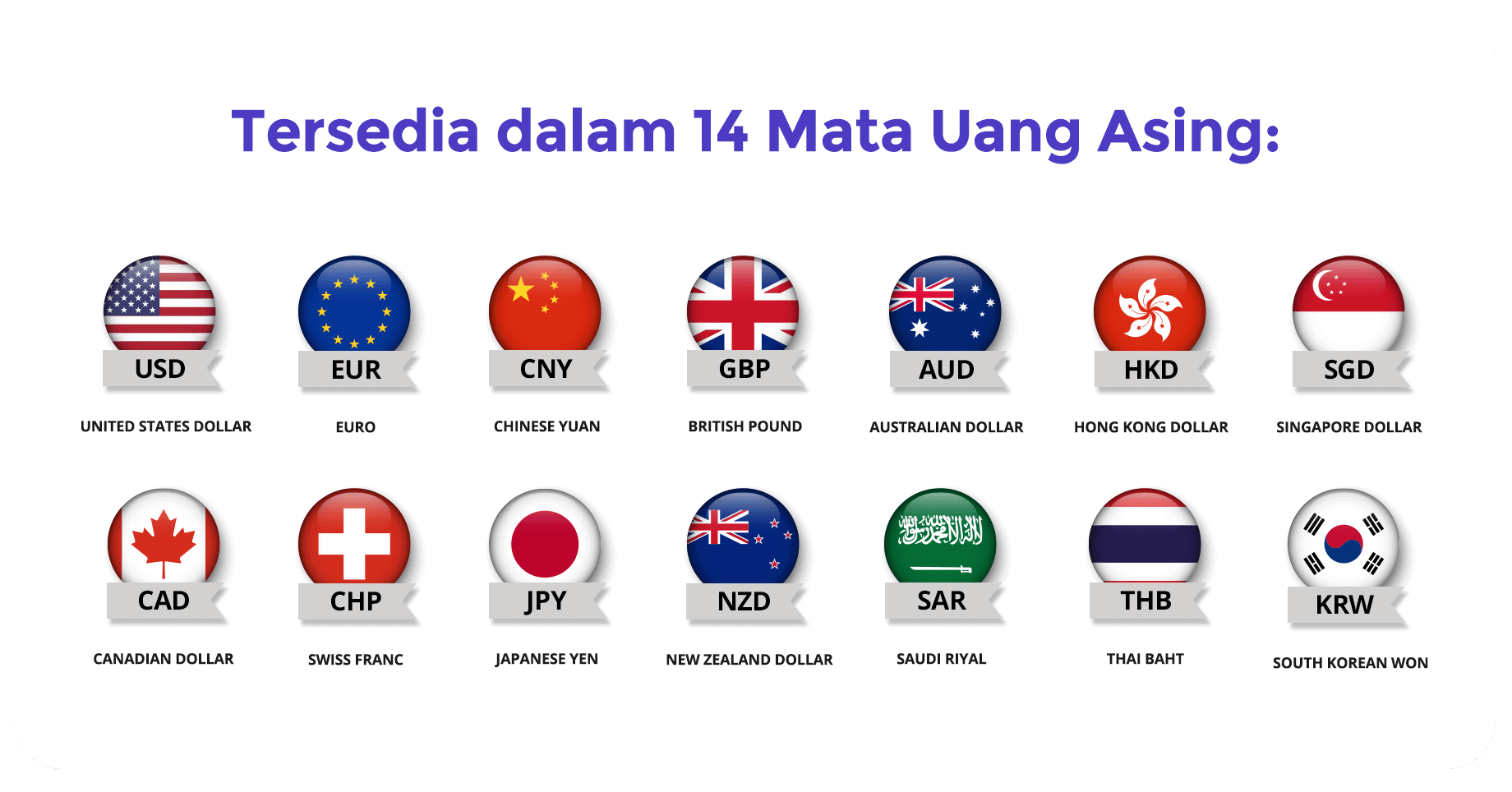 Manfaat memiliki valuta asing (valas) sulit terdampak devaluasi atau penurunan nilai. Tersedia 14 mata uang yang dapat dipakai saat ke luar negeri tanpa konversi kurs