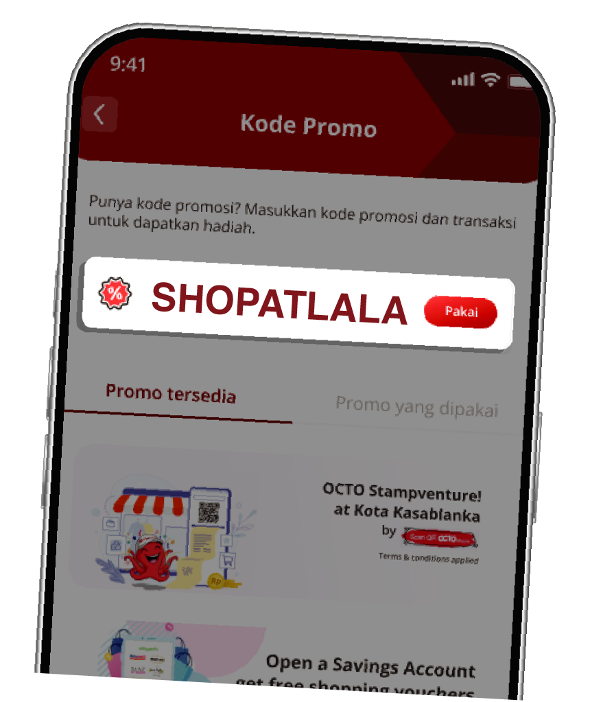 2. Pengunjung wajib memasukkan kode promo: SHOPATLALA di akun OCTO sebelum melakukan transaksi.
