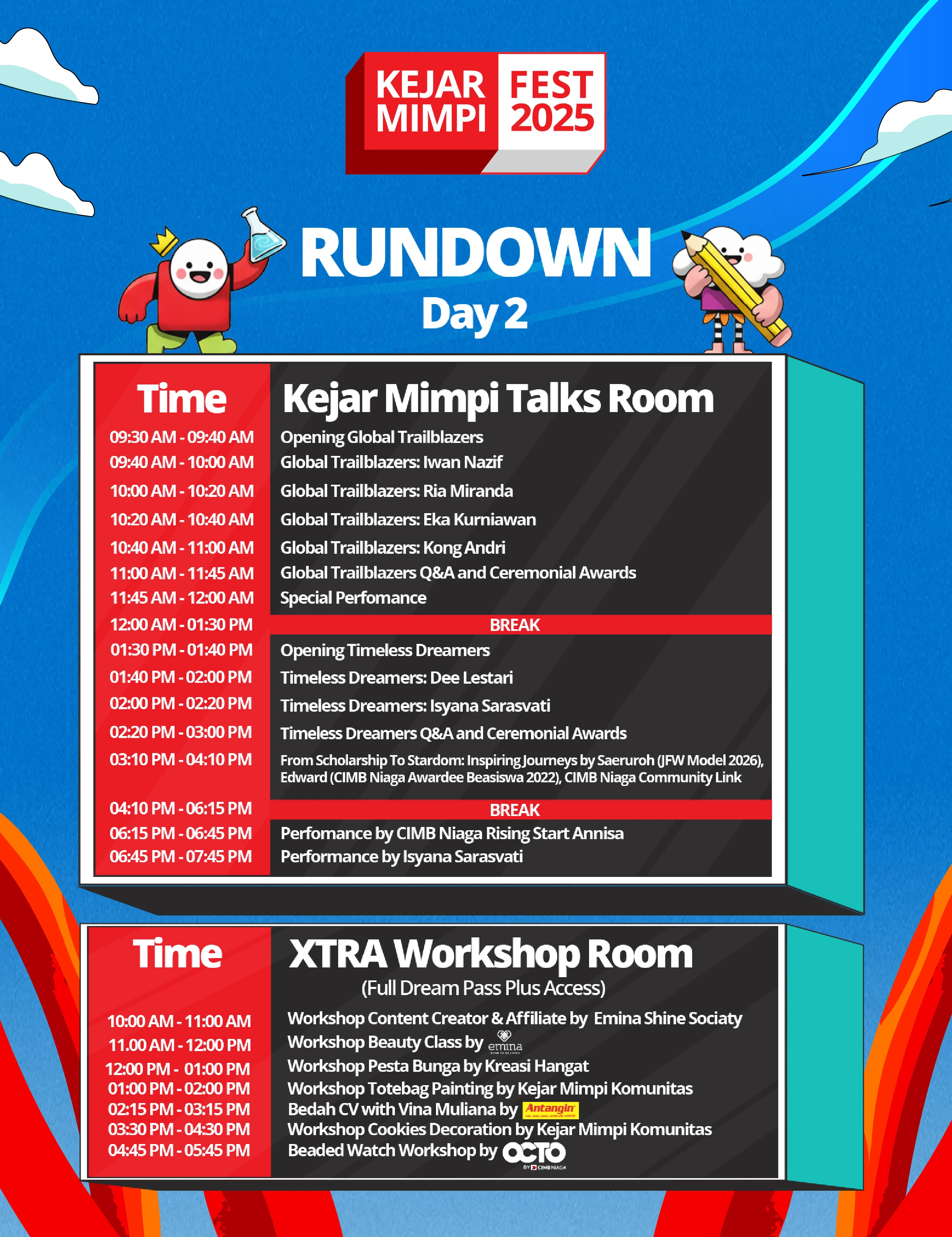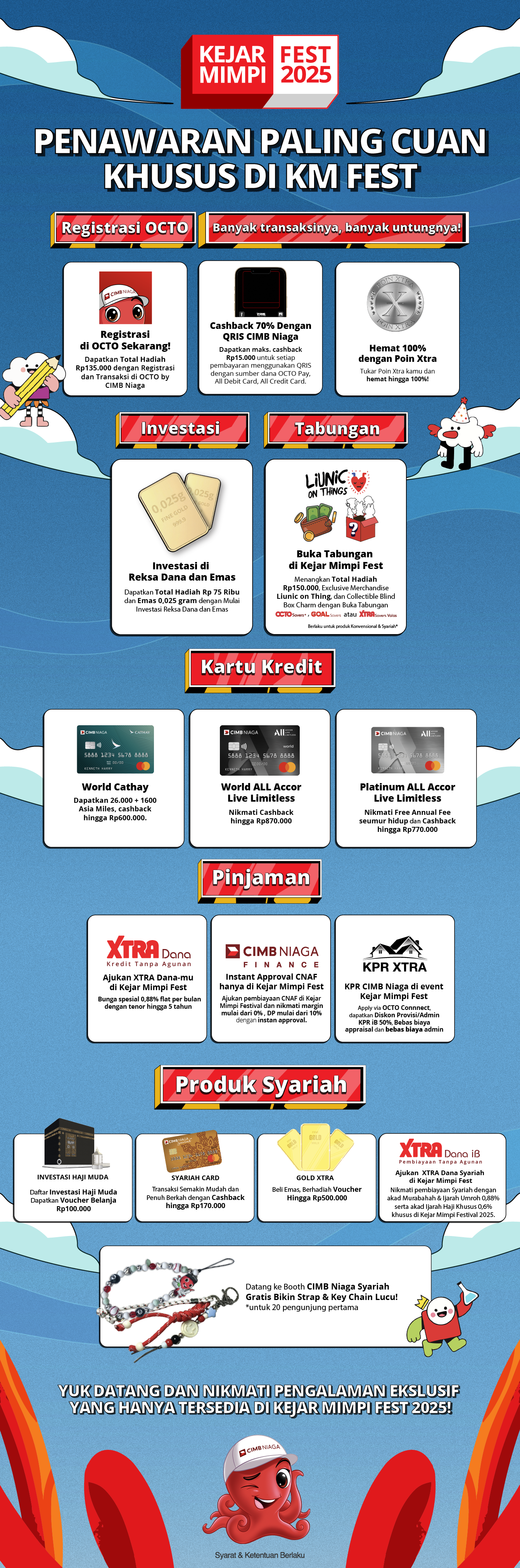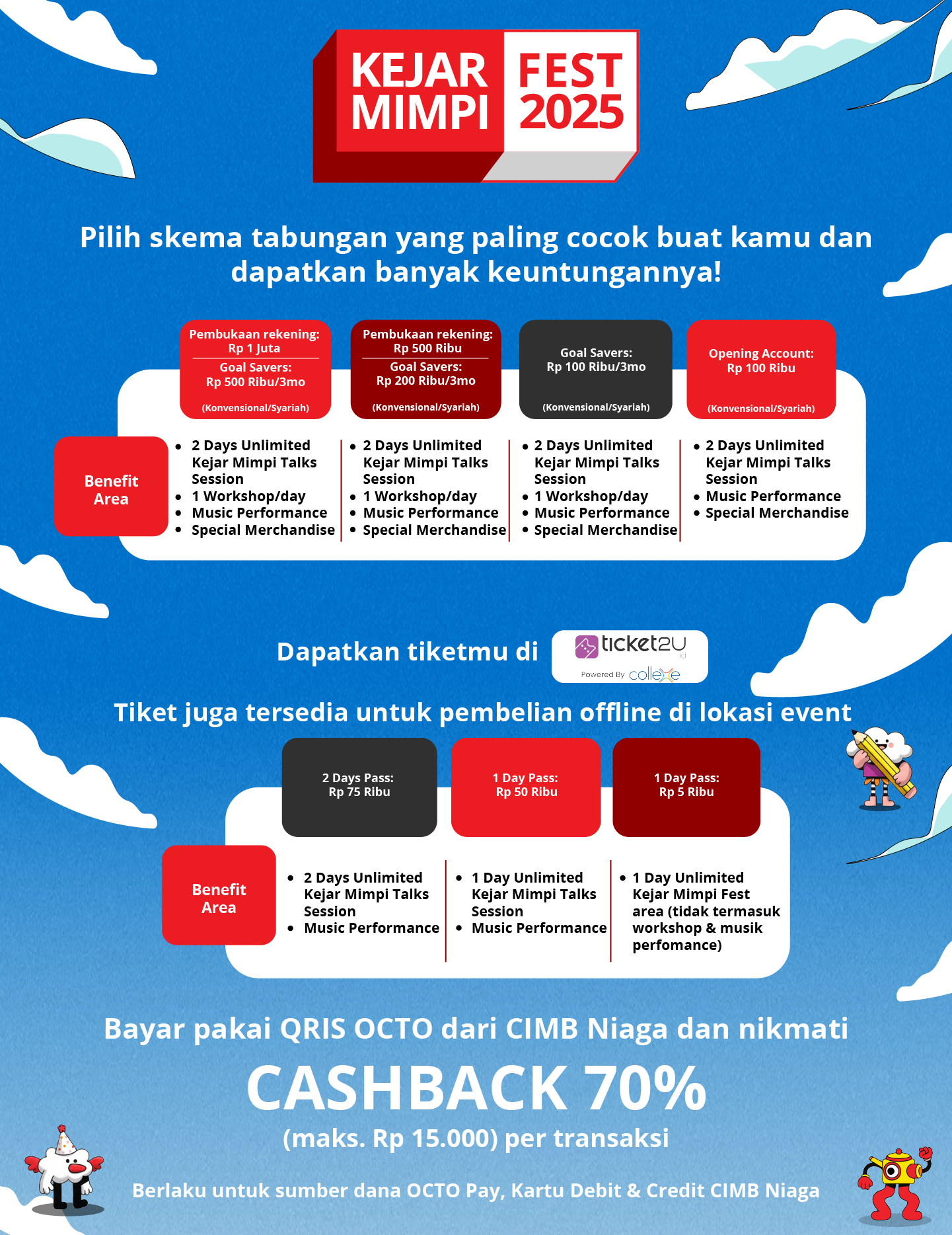 CIMB Niaga Kejar Mimpi Fest hadir sebagai titik temu yang menggabungkan edukasi, kreativitas dan peluang nyata untuk mewujudkannya. Nikmati beragam keseruan dan hadiah menarik, termasuk tiket pesawat PP Jakarta – Thailand & menginap 3 Hari 2 Malam
