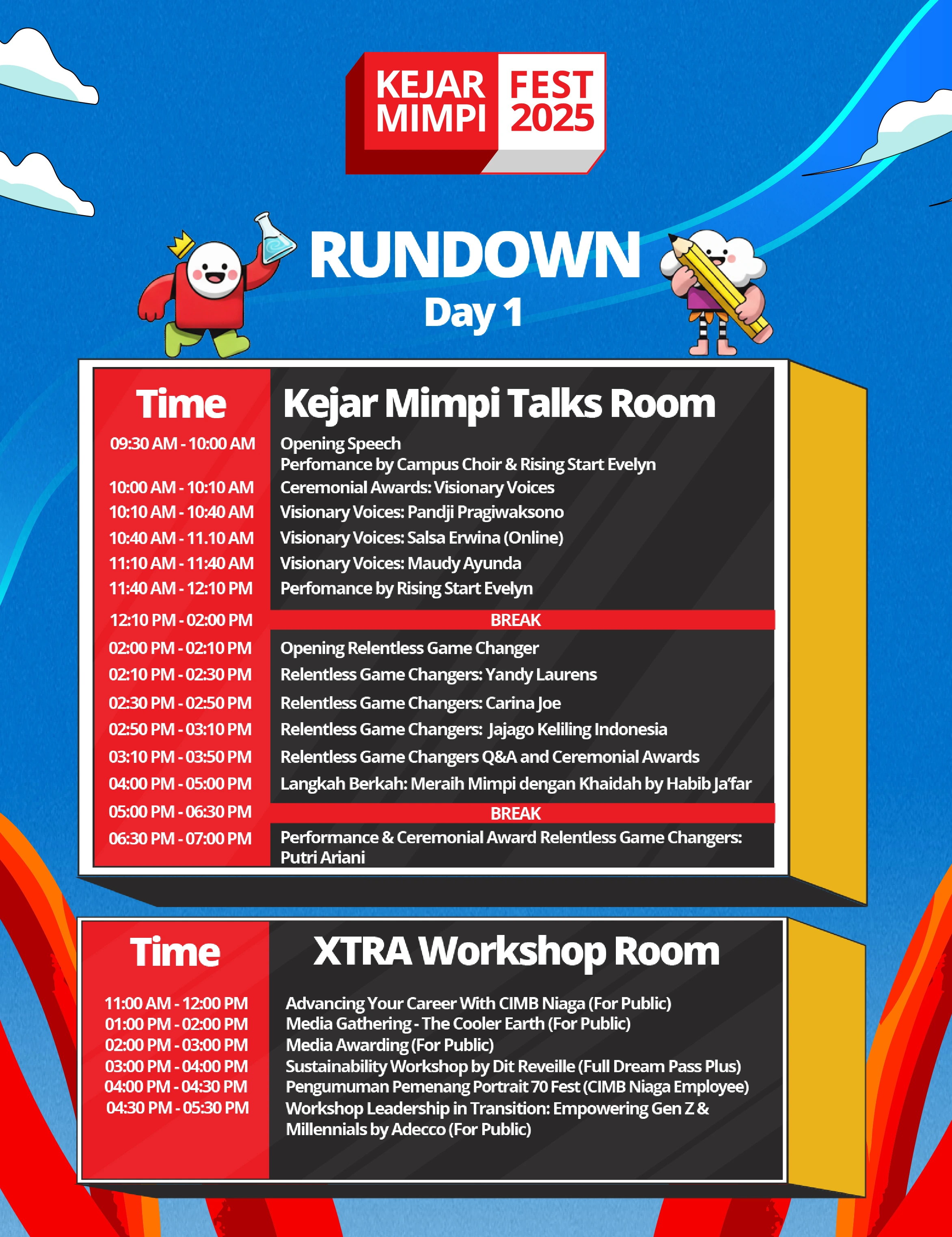Kejar Mimpi Talks menghadirkan para visioner, kreator, dan inovator dari seluruh Indonesia untuk berbagi kisah keberanian, tujuan hidup, dan dampak nyata, menginspirasi generasi lewat perjalanan mengejar mimpinya.