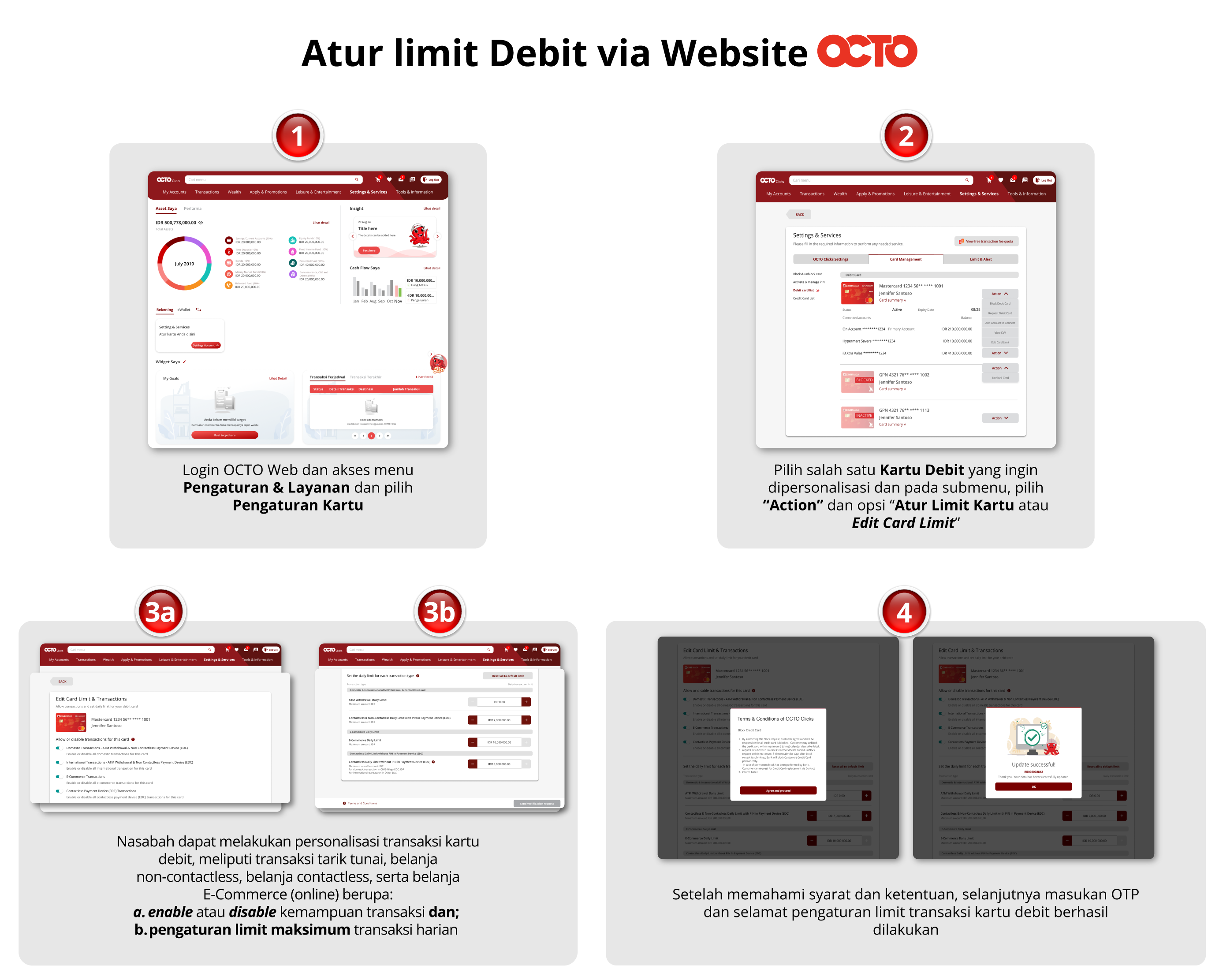 Nasabah dapat mengatur limit harian dan jenis transaksi hingga 5 kali dalam 1 hari melalui OCTO Application dan Web dengan langkah berikut: