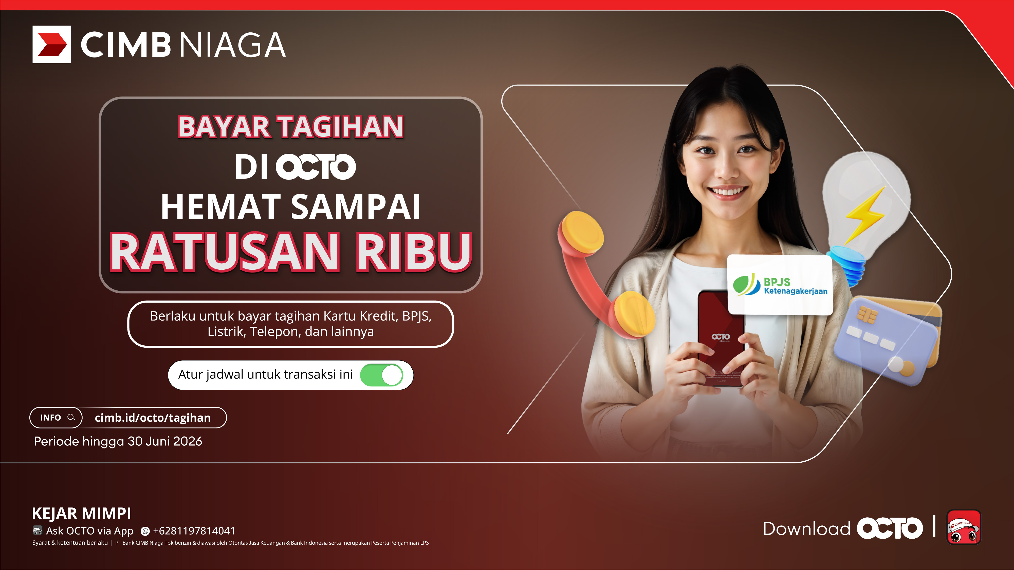 Program PayDay Kartu Debit CIMB Niaga (Produk Tabungan) dengan benefit hemat hingga Rp 250 ribu di merchant-merchant pilihan (Traveloka, GRAB, Shopee, Tokopedia, Gojek, Kopi Kenangan, Chigo x Flip, McD & Alfamidi). Dapatkan cashback 30% maksimal Rp 10.000 tanpa minimum transaksi dengan scan QRIS OCTO sumber dana Tabungan di merchant pilihan (Hokben, Gokana, Beard Papa’s, Platinum, Raa Cha, Platinum Grill, BMK, Chopstik dan merchant lainnya).