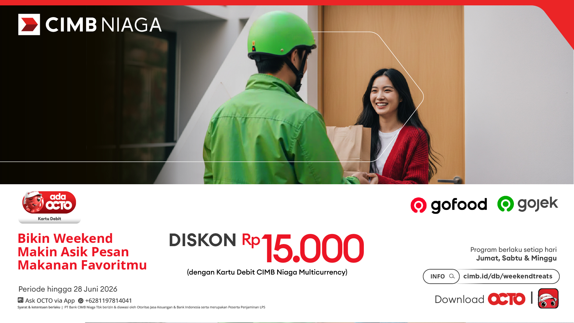 Program Kartu Debit CIMB Niaga Multicurrrency (Tabungan) khusus selama weekend (Jumat-Minggu) berupa diskon langsung Rp 15 ribu yang berlaku untuk transaksi GoFood di aplikasi Gojek.