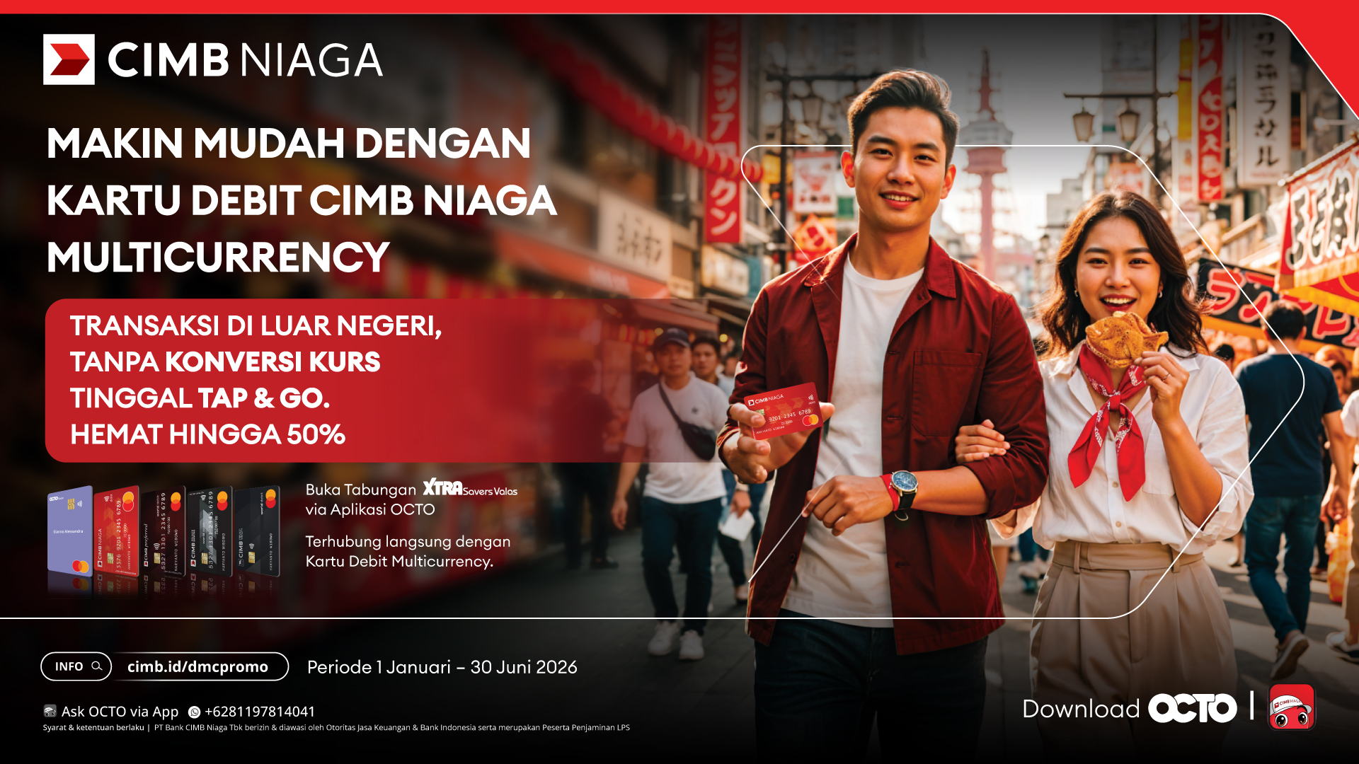 Program eksklusif hemat hingga 50% transaksi di merchant luar negeri (Asia Tenggara, Jepang, Korea Selatan, Australia, Hongkong, Arab Saudi & China) dengan Kartu Debit CIMB Niaga Multicurrency dan dapatkan cashback s/d Rp 500 ribu!