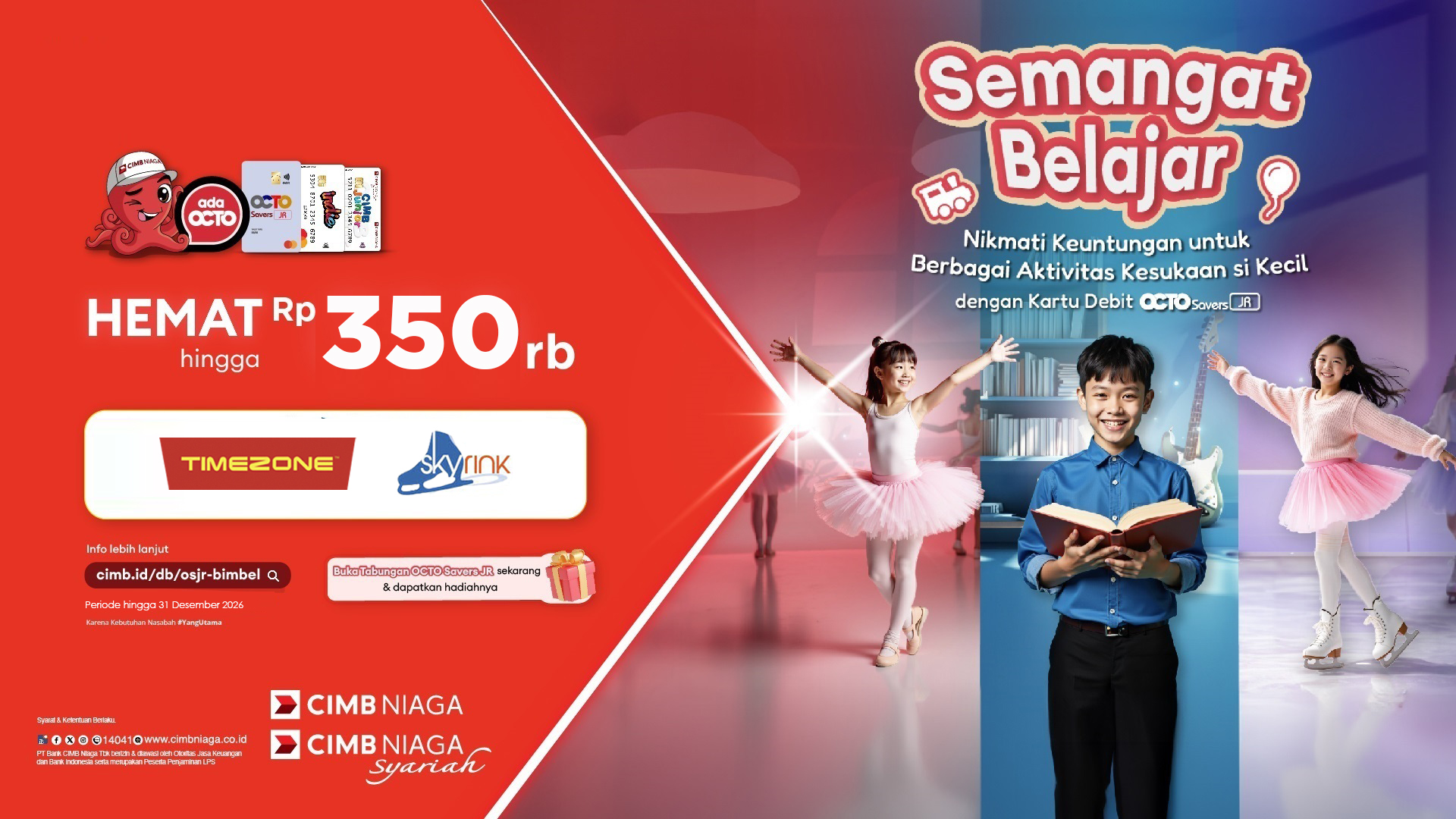 Penawaran weekend special dengan Kartu Debit CIMB Niaga OCTO Savers Jr. di merchant & Bimbel pilihan. Hemat hingga Rp 350 ribu!