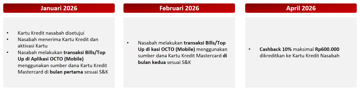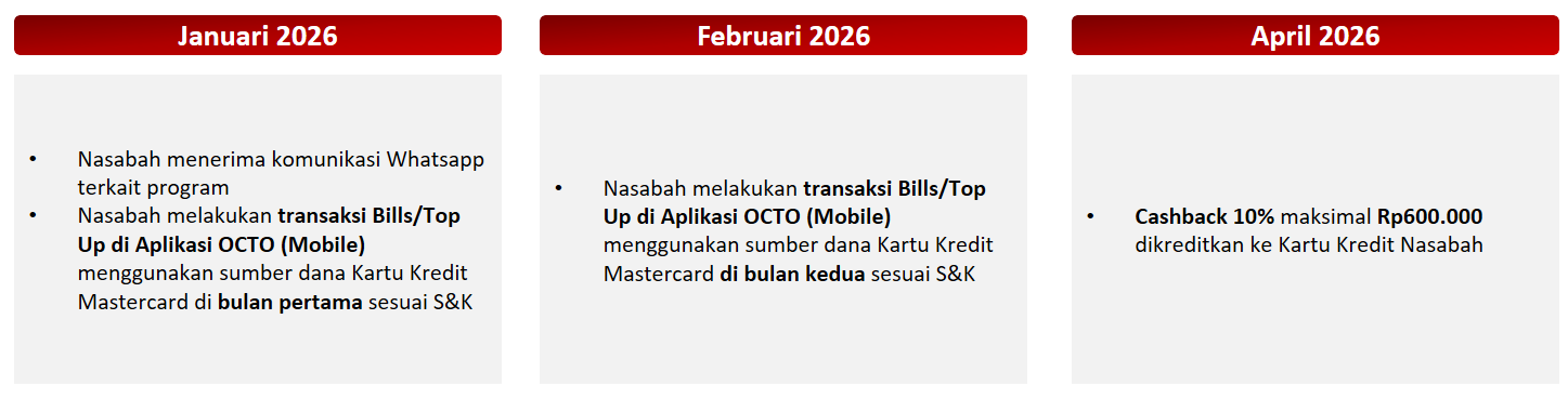 Contoh: Nasabah melakukan pembayaran telepon pascabayar di Aplikasi OCTO pada bulan pertama, maka di bulan kedua nasabah harus kembali melakukan telepon pascabayar untuk mendapatkan cashback.