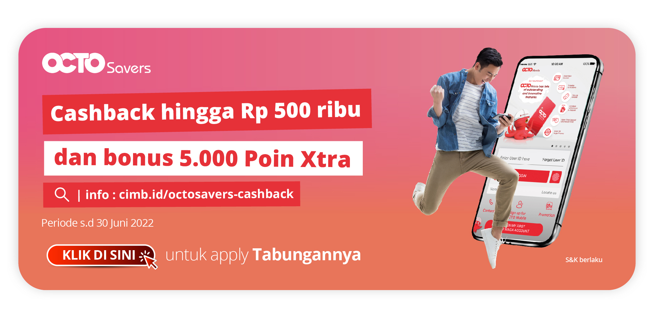 Syarat & ketentuan Cashback hingga Rp 500.000 dan bonus 5.000 Poin Xtra : cimb.id/octosavers-cashback