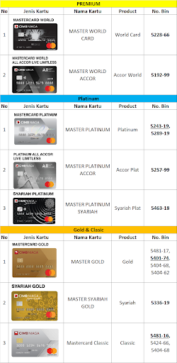Jenis Kartu Kredit dan Debit Mastercard yang berlaku sbb :