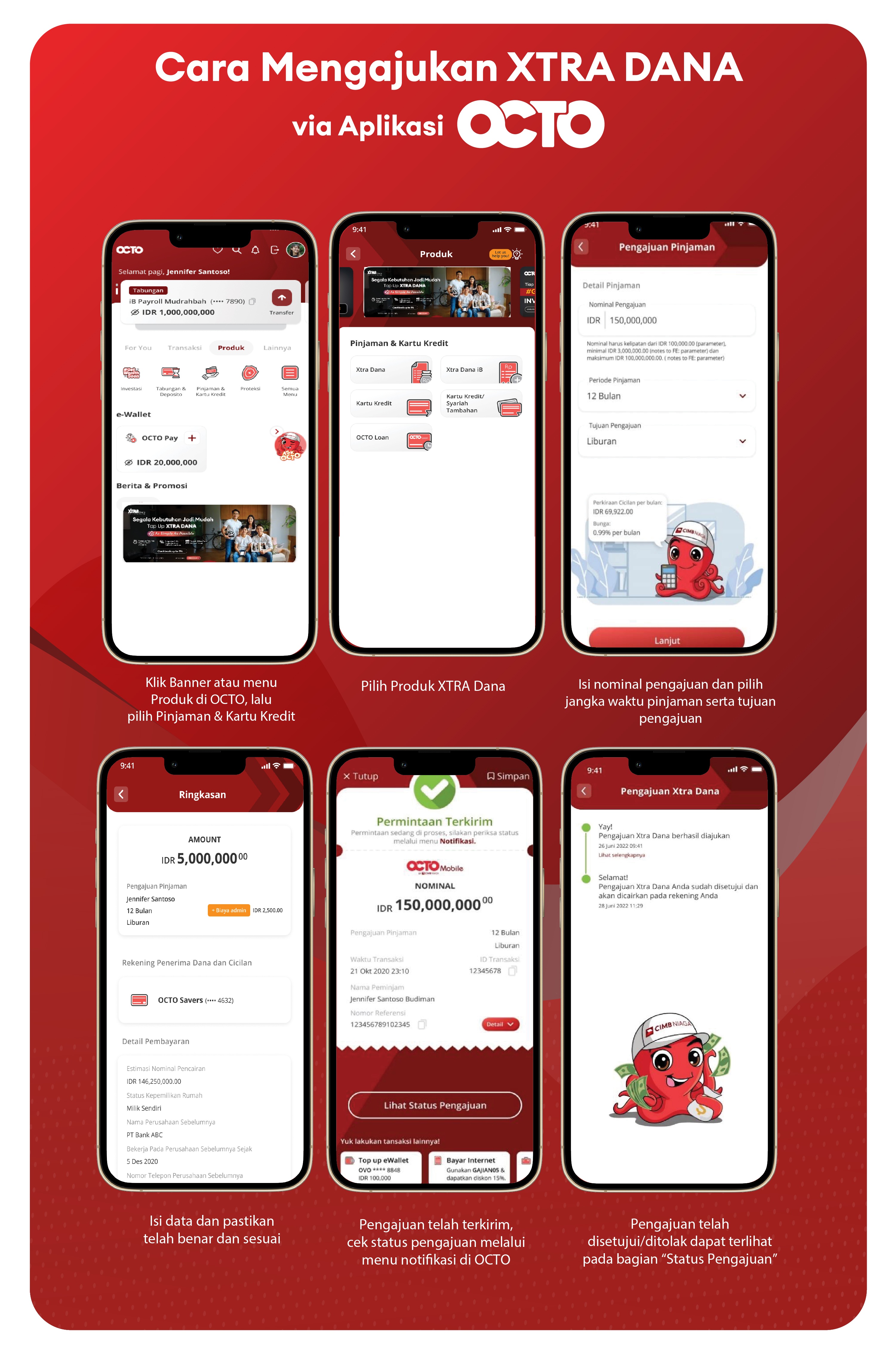Apapun kebutuhan Anda, XTRA Dana hadir sebagai solusi pinjaman dengan beragam kemudahan. Ajukan XTRA Dana sekarang melalui Aplikasi OCTO!