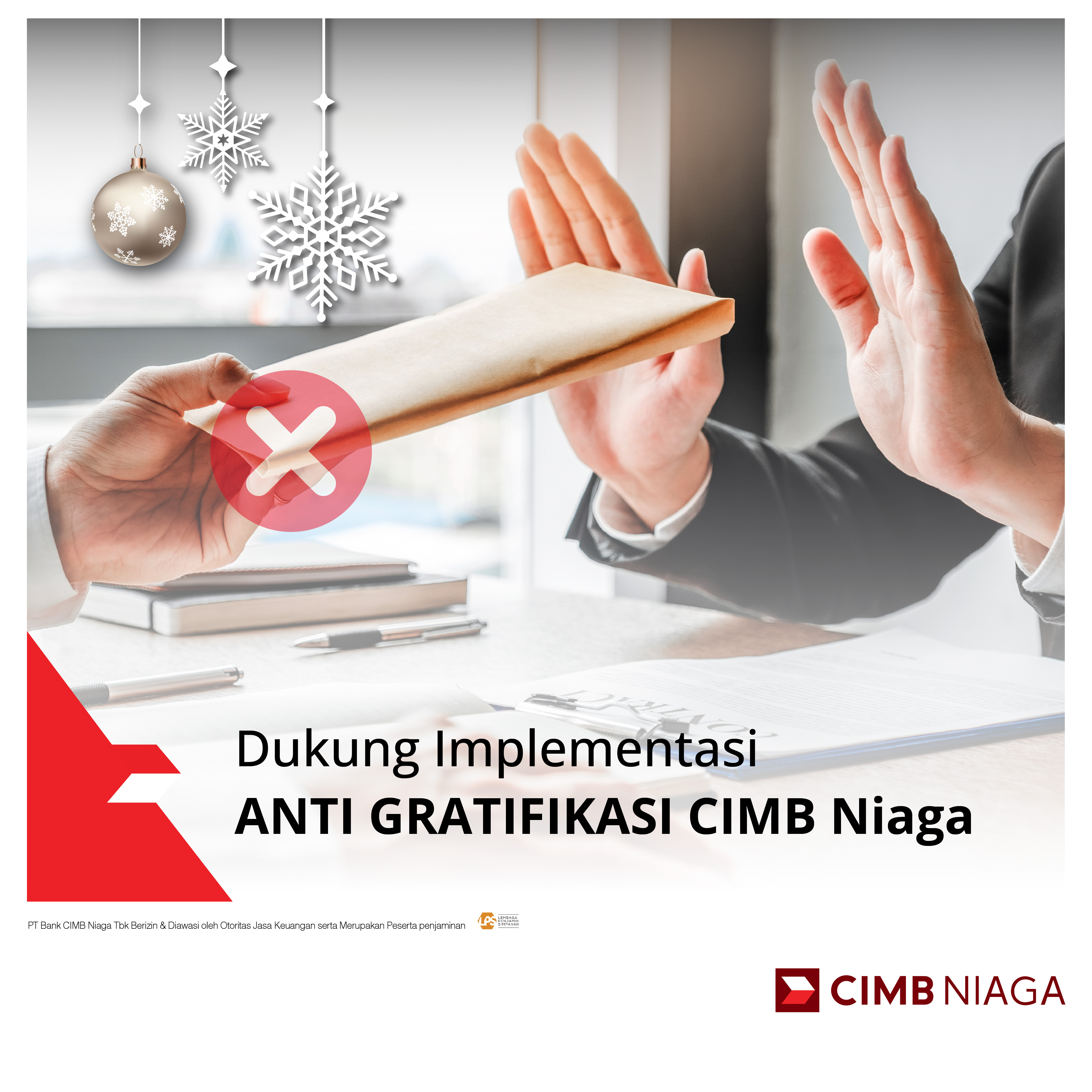 Sesuai dengan Komitmen Antisuap & Korupsi di CIMB Niaga dan menghindari tindakan gratifikasi serta penyalahgunaan wewenang jabatan, maka kami menghimbau Bapak/Ibu untuk tidak memberikan parsel/bingkisan, tunjangan hari raya atau hadiah dalam bentuk apapun kepada Komisaris, Direktur serta seluruh karyawan CIMB Niaga, tanpa terkecuali.