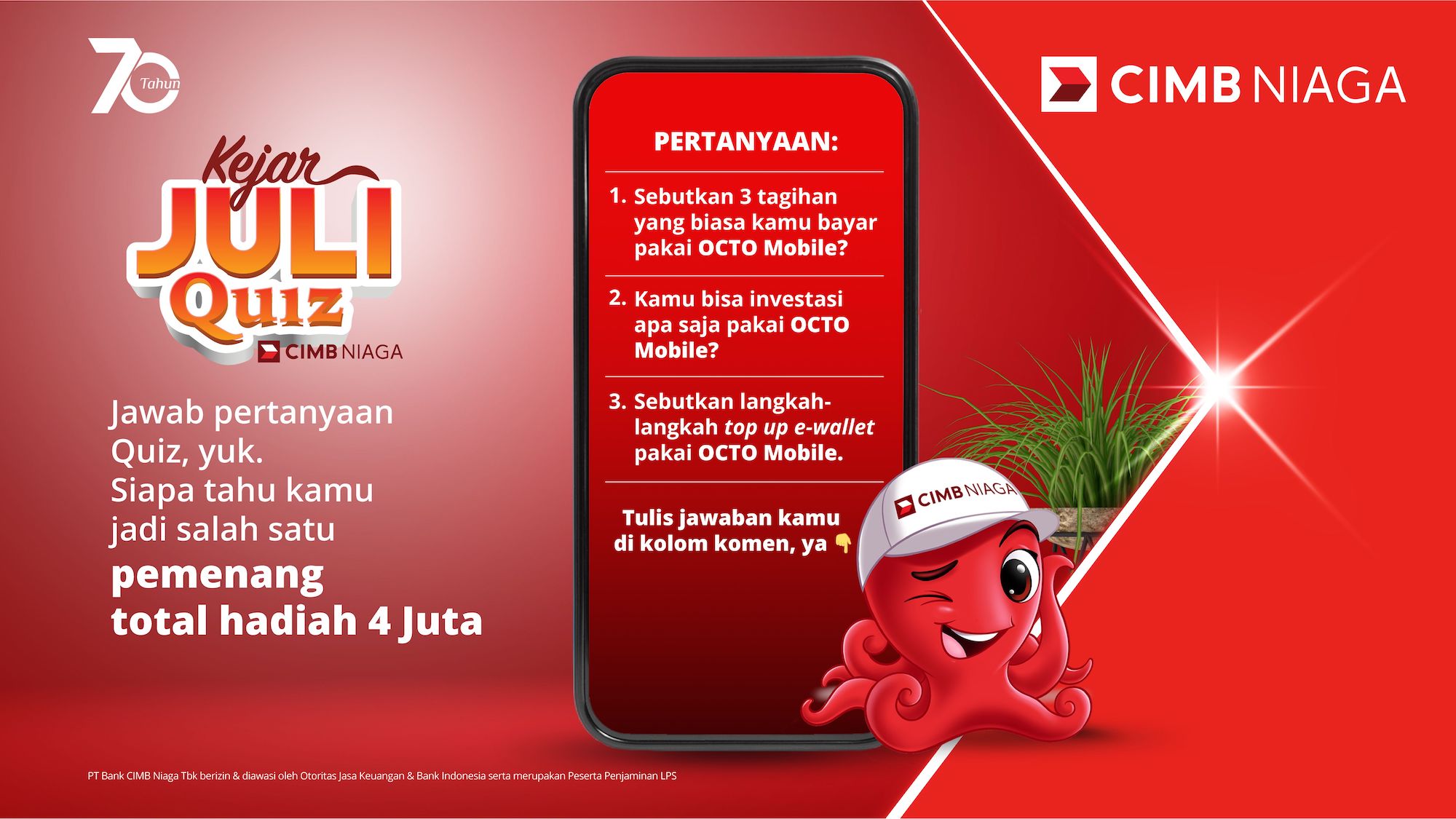 - Kejar Juli Quiz CIMB Niaga terdiri dari 3 Putaran. Putaran pertama di Instagram sudah selesai dilaksanakan. Saat ini kita berada di Putaran Kedua di Facebook dengan 5 Pemenang, masing-masing mendapatkan hadiah Saldo OCTO Pay @Rp200.000. Sedangkan Putaran Ketiga akan diselenggarakan di X.