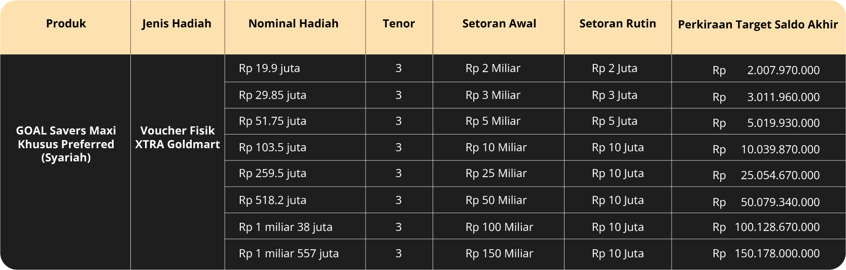 Benefit Maximal dengan Tabungan Berjangka GOAL Savers yang dapat digunakan khusus oleh nasabah Preferred menabung rutin dengan fitur autodebet dengan target waktu. Nasabah dapat menukarkan Hadiah voucher Goldmart dengan Logam Mulia Antam