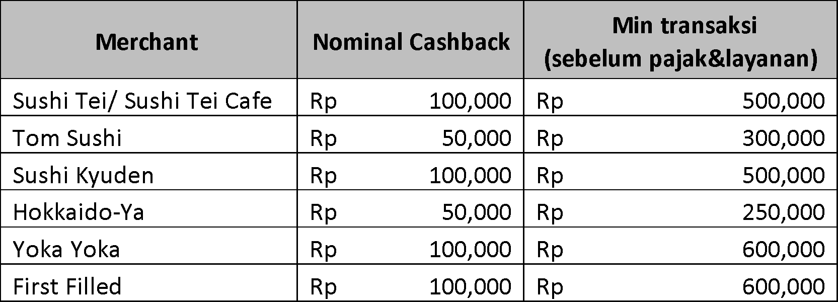 - Program berlaku untuk dine-in di seluruh outlet Sushi Tei Group di Indonesia
