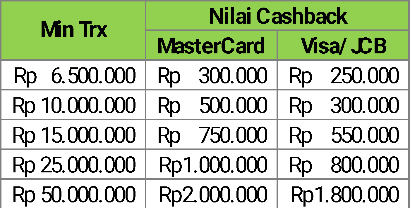 - Cashback Rp.2juta atau Rp. 1,8juta diberikan kepada nasabah yang melakukan transaksi pembayaran menggunakan cicilan 0% tenor 12 bulan