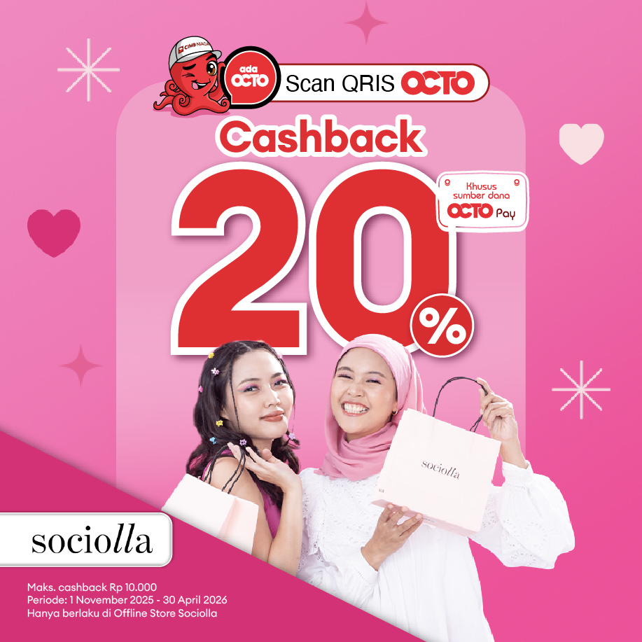 Cashback 20% (maksimum cashback Rp10.000) (sepuluh ribu rupiah) di toko offline Sociolla, pembayaran dengan Scan QRIS OCTO.