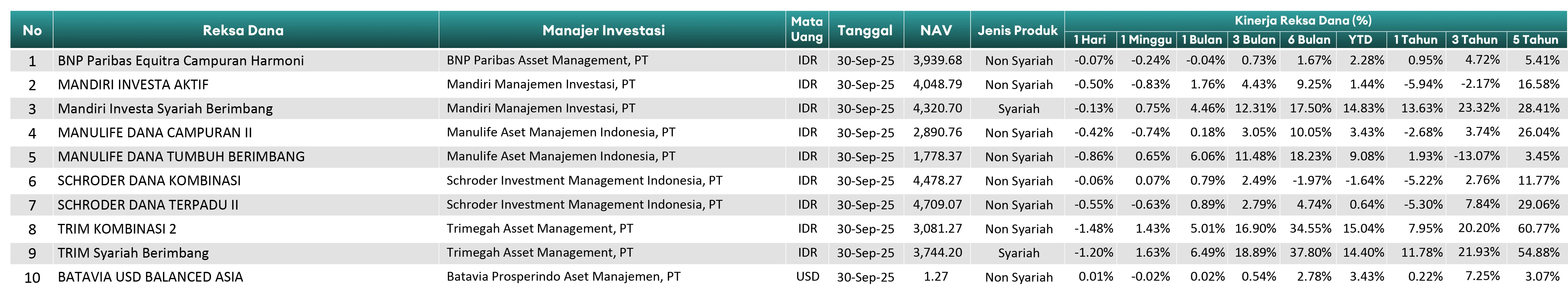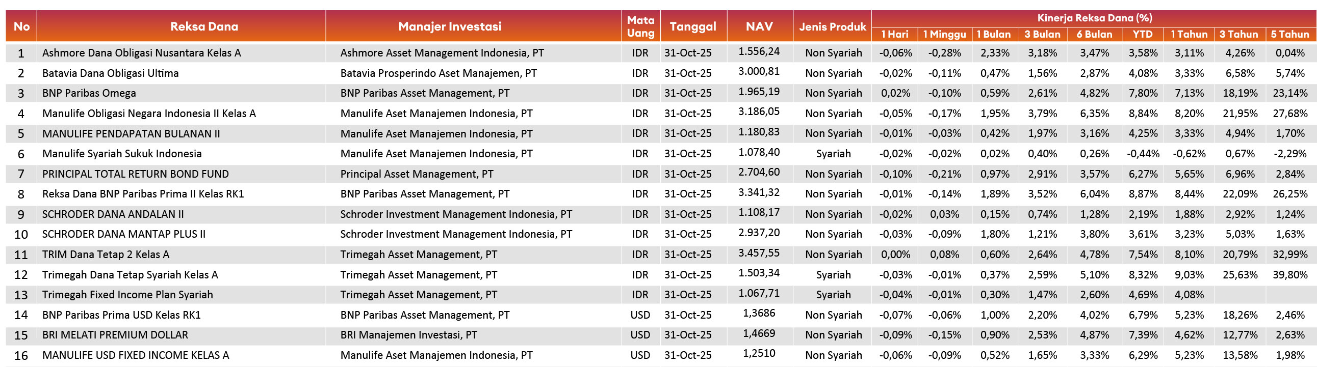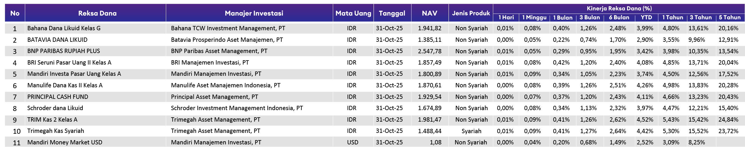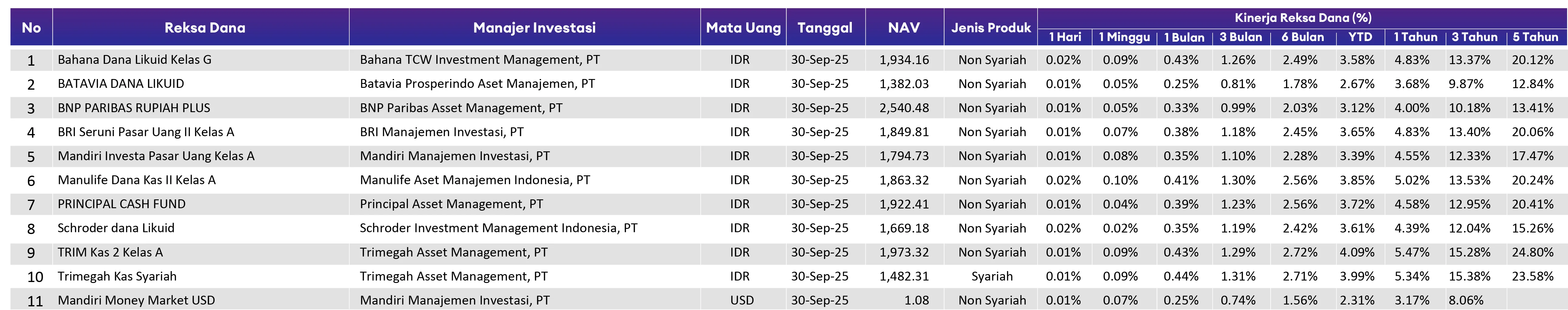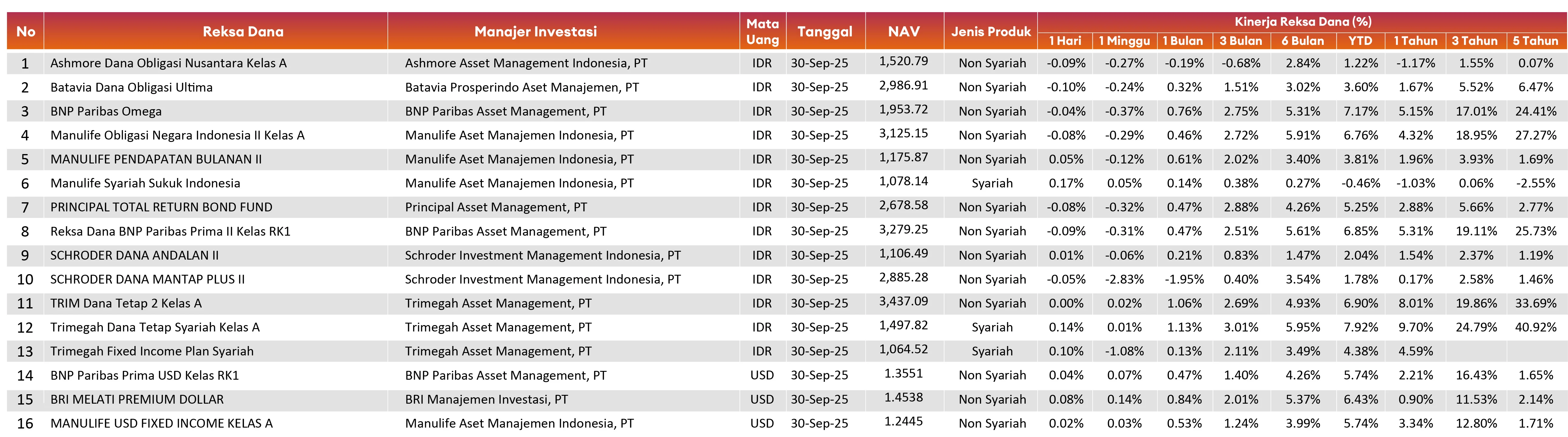 Daftar Produk & Kinerja Reksa Dana di bawah mengacu pada posisi tanggal yang tertera dan diperbarui secara bulanan.