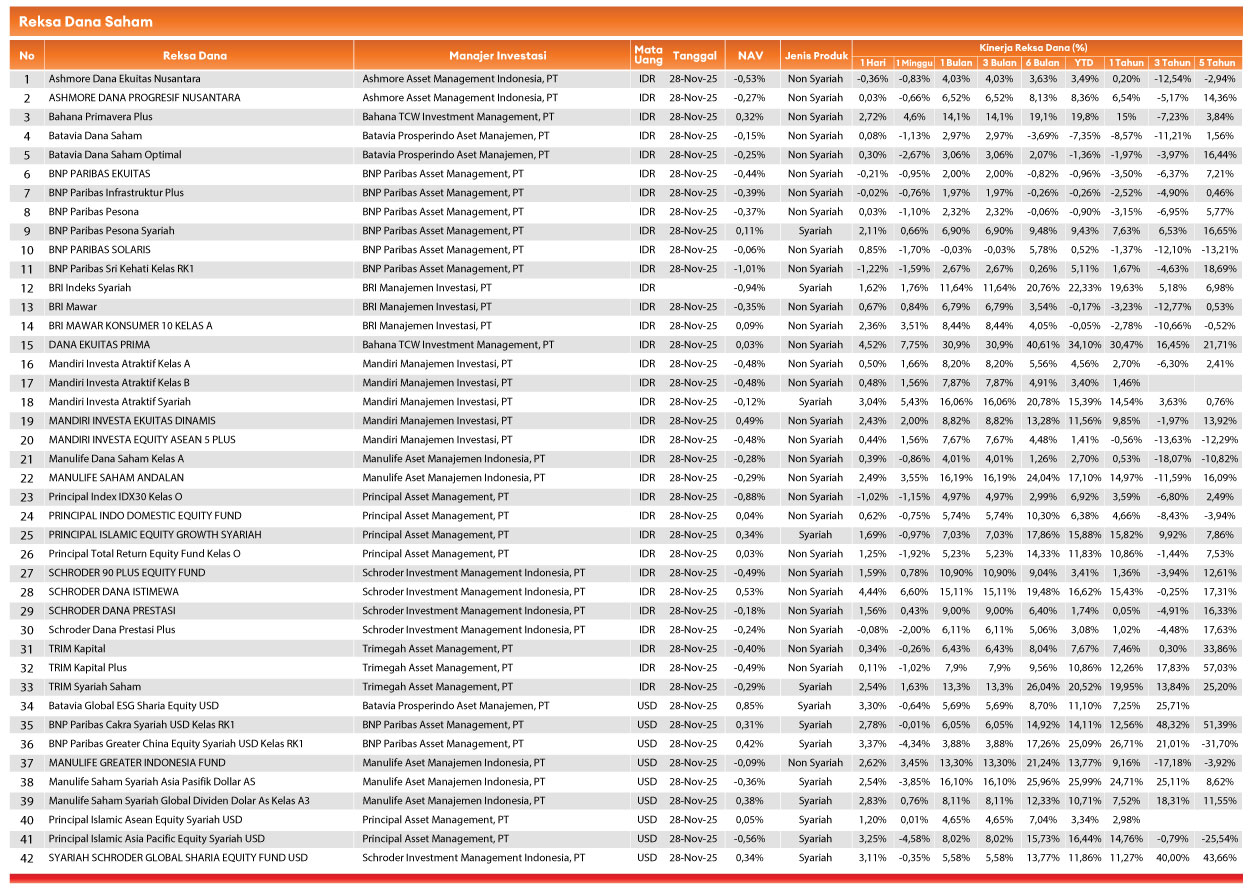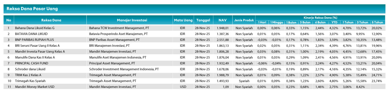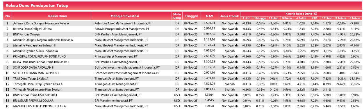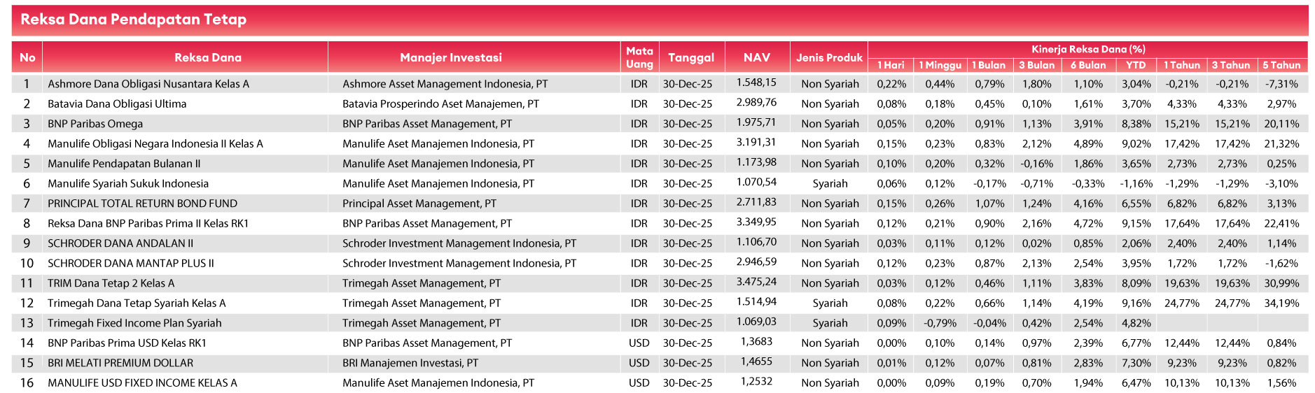 Daftar Produk Reksa Dana dikategorisasikan berdasarkan Jenis Reksa Dana (Pasar Uang, Pendapatan Tetap, Campuran dan Saham) dengan denominasi dalam mata uang IDR dan USD.