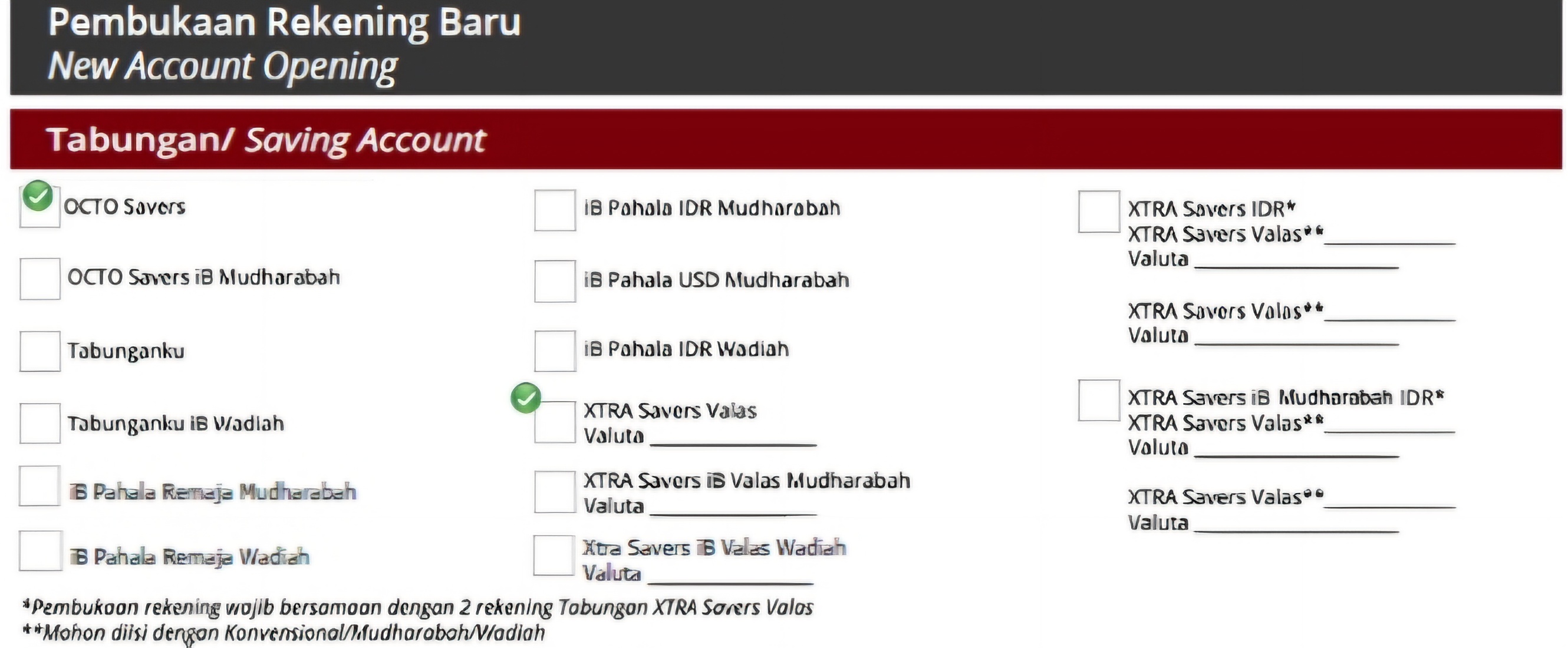 Pembukaan rekening valas dapat dilakukan bersamaan dengan rekening IDR menggunakan form pembukaan rekening baru sebagai berikut: