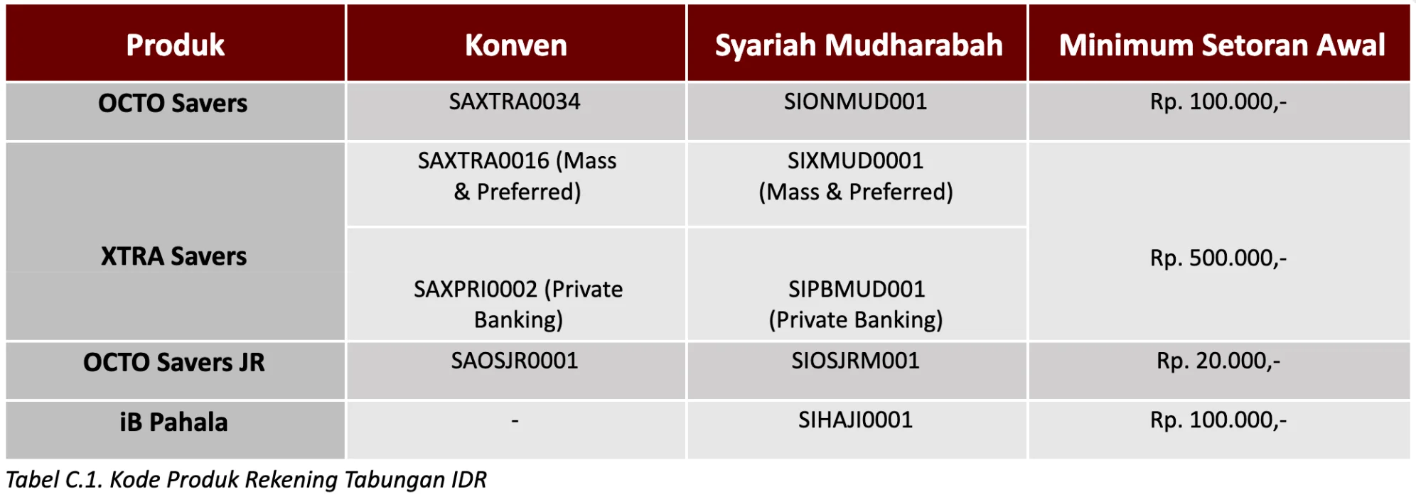 Nasabah wajib membuka tabungan IDR dengan kode produk yang berlaku di Cabang/Digital Lounge/OCTO Smart dengan ketentuan sebagai berikut:
