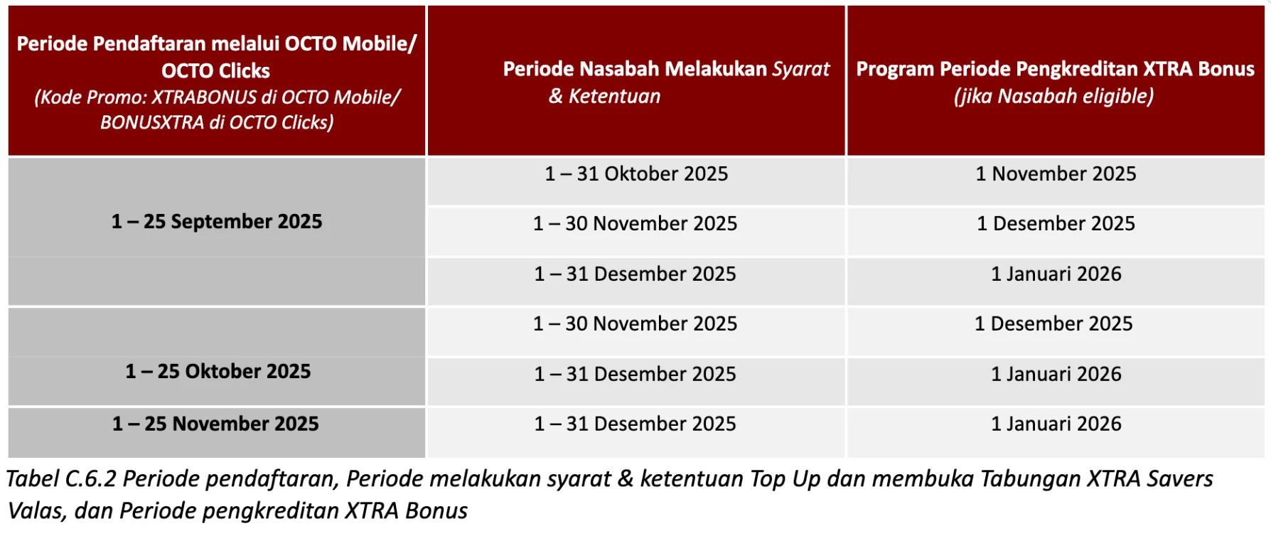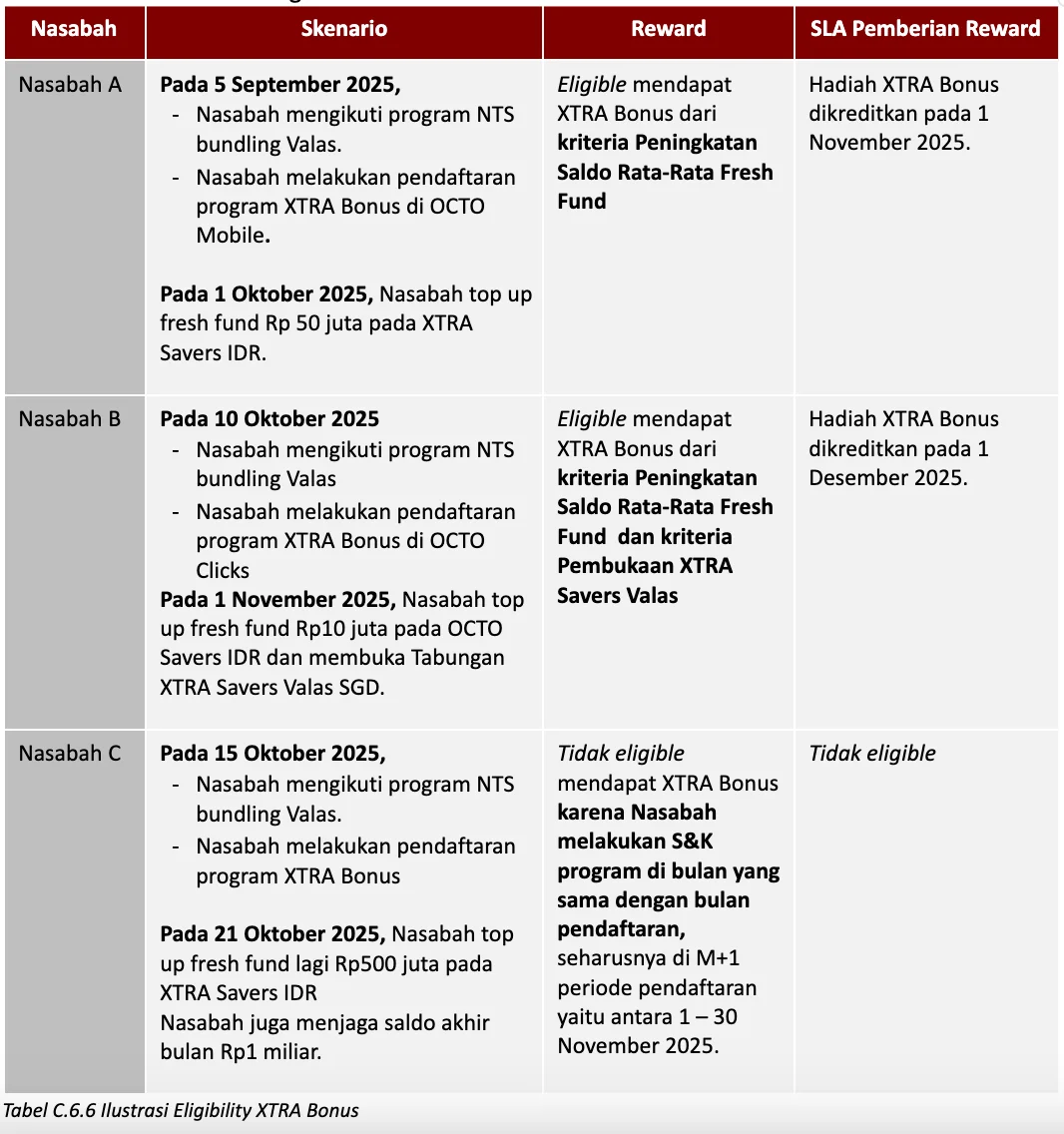 OCTO Savers / OCTO Savers Jr / XTRA Savers / iB Pahala bundling dengan Tabungan XTRA Savers Valas, WM Produk, dan GOAL Savers untuk memperoleh hadiah. Nasabah akan diberikan hadiah berupa cashback/Poin Xtra atau GOLDBAR (Logam Mulia Antam) yang dapat ditukarkan dari e-voucher GOLDMART. Nasabah juga dapat mendaftar dan mengikuti program XTRA Bonus untuk mendapatkan lebih banyak hadiah.