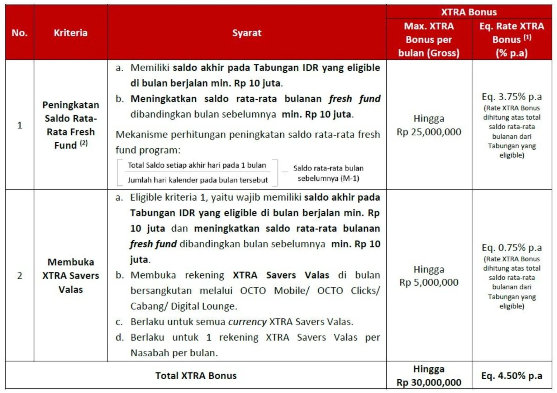 | Total XTRA Bonus | Hingga Rp 30,000,000 | Eq. 4.50% p.a | ||