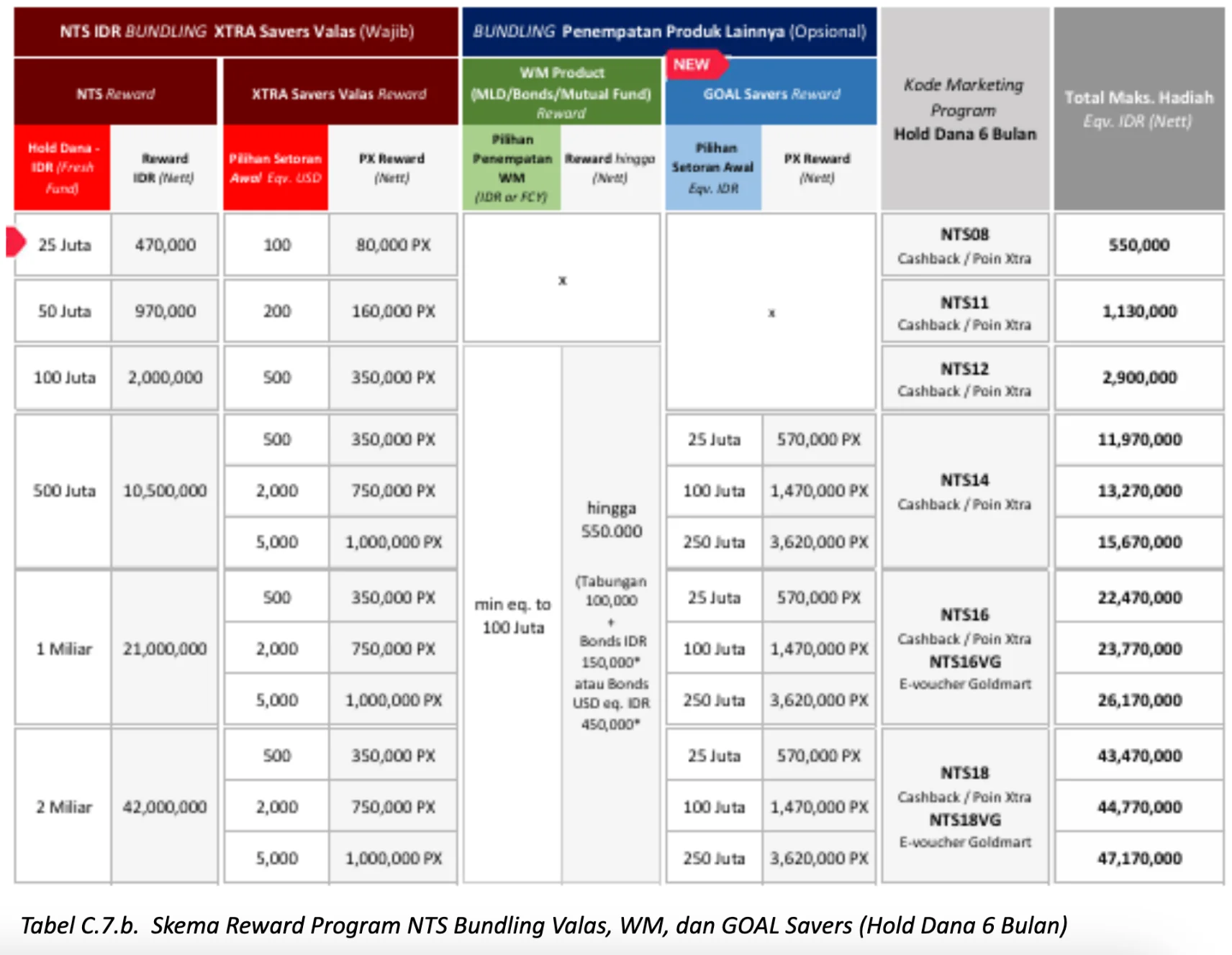 b. Total Hadiah untuk Hold Dana 6 Bulan, apabila membuka NTS IDR bundling XTRA Savers Valas, produk WM, dan GOAL Savers: