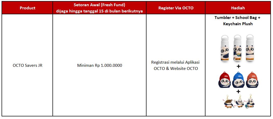 Nasabah wajib membuka rekening OCTO Savers JR (konvensional/iB) dengan setoran awal minimum Rp 1 Juta.