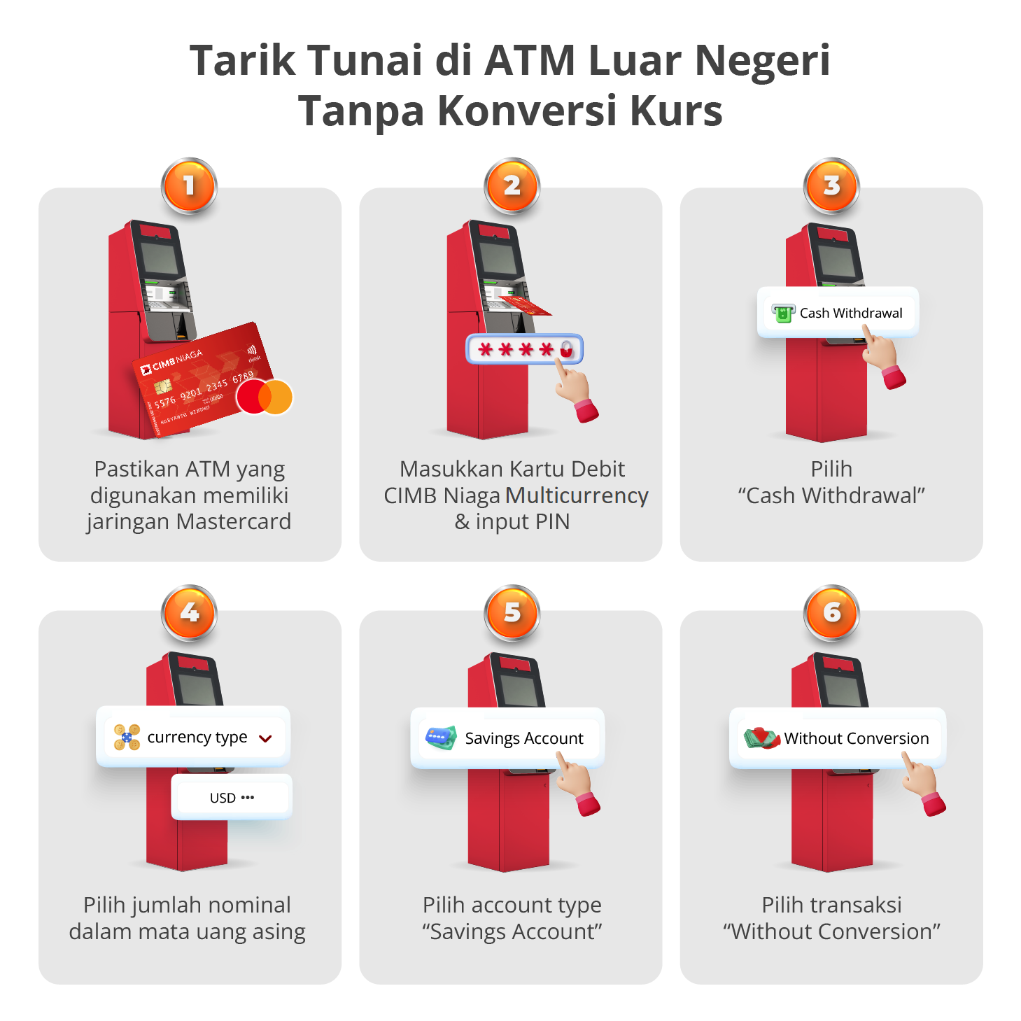 Untuk menikmati transaksi bebas konversi, pastikan Kartu Debit CIMB Niaga Mastercard terhubung dengan rekening XTRA Savers Valas sesuai dengan mata uang negara tujuan.