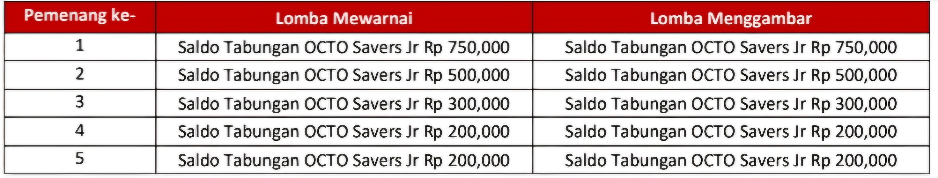 1. Produk yang eligible untuk pemberian hadiah lomba menggambar dan mewarnai adalah produk rekening tabungan OCTO Savers Jr (Konvensional / iB).