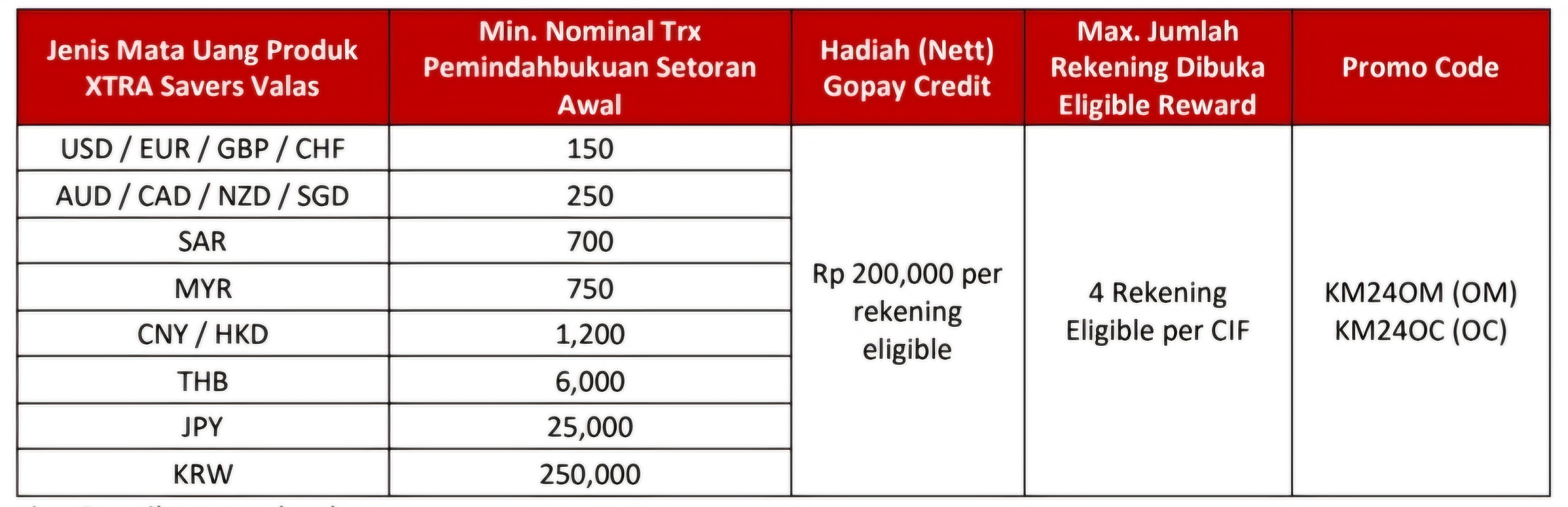 a. Nasabah wajib menginput Kode Promo KM24OM saat pembukaan rekening Tabungan XTRA Savers Valas (konven/iB) via OCTO Mobile atau KM24OC saat pembukaan pada OCTO Clicks, tanpa Kode Promo maka nasabah tidak eligible
