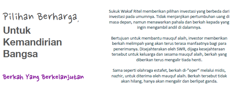 Penerbitan Sukuk Wakaf Ritel seri SWR004 merupakan salah satu bentuk komitmen Pemerintah untuk mendukung Gerakan Nasional Wakaf Uang, membantu pengembangan investasi sosial dan pengembangan wakaf produktif di Indonesia. Penerbitan Sukuk Wakaf Ritel seri SWR004 dikelola berdasarkan prinsip syariah serta telah mendapatkan pernyataan kesesuaian syariah dari Dewan Syariah Nasional – Majelis Ulama Indonesia (DSN - MUI). Melalui Sukuk Wakaf Ritel seri SWR004, Pemerintah bertujuan memfasilitasi para pewakaf uang baik yang bersifat temporer maupun permanen agar dapat menempatkan wakaf uangnya pada instrumen investasi yang aman dan produktif.
