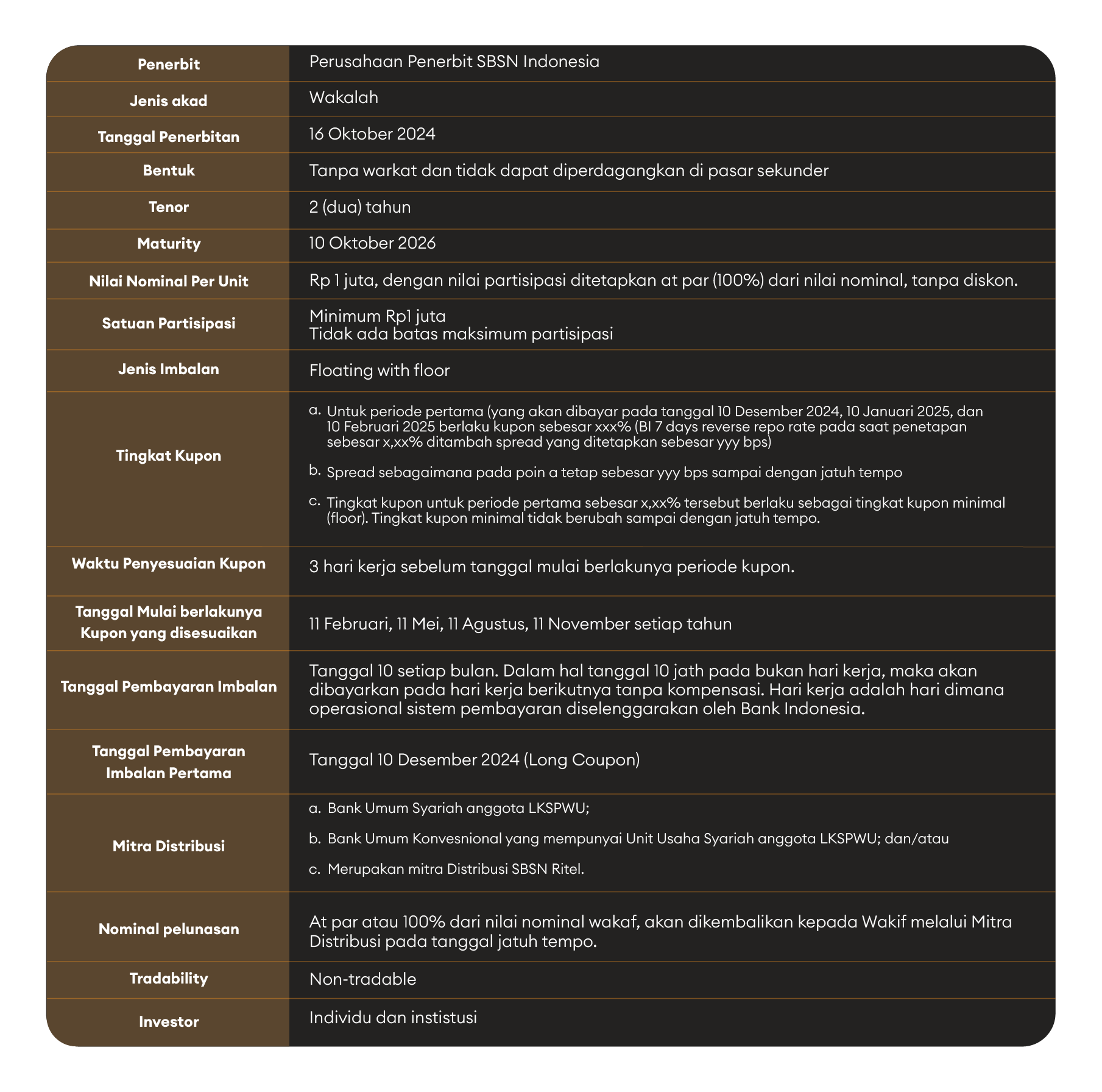 CWLS Ritel atau Sukuk Wakaf memberikan pilihan investasi yang berbeda dari investasi pada umumnya. Tidak menjanjikan pertumbuhan uang di masa depan, namun menawarkan pahala dan berkah kepada yang ingin mengambil andil di dalamnya. Bertujuan untuk membantu mauquf alaih, investor memberikan berkah melimpah yang akan terus terasa manfaatnya bagi para penerimanya. Disejahterakan oleh CWLS Ritel, dijaga kesejahteraan tersebut untuk keluarga dan sesama mauquf alaih, berkah yang diberikan terus mengalir tiada henti.