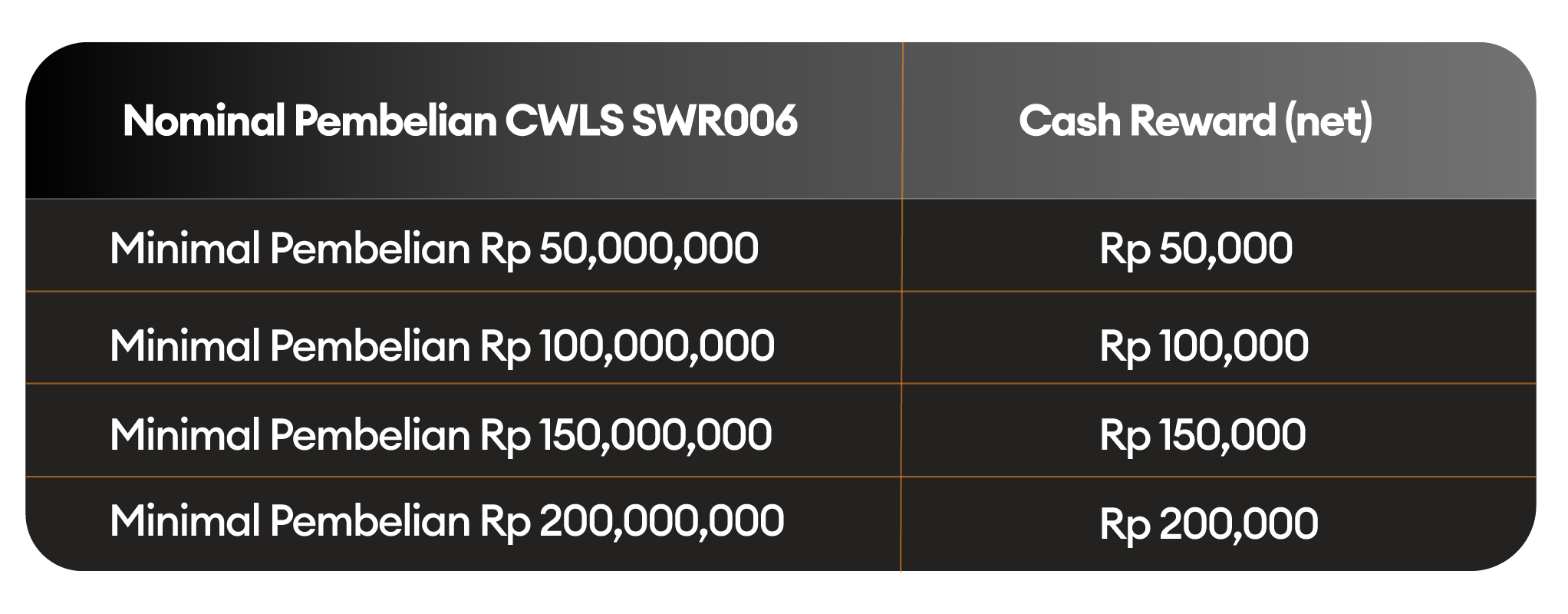 - Cash reward akan ditransfer ke rekening yang dipakai untuk pembelian SWR006, 3 bulan setelah tanggal settlement