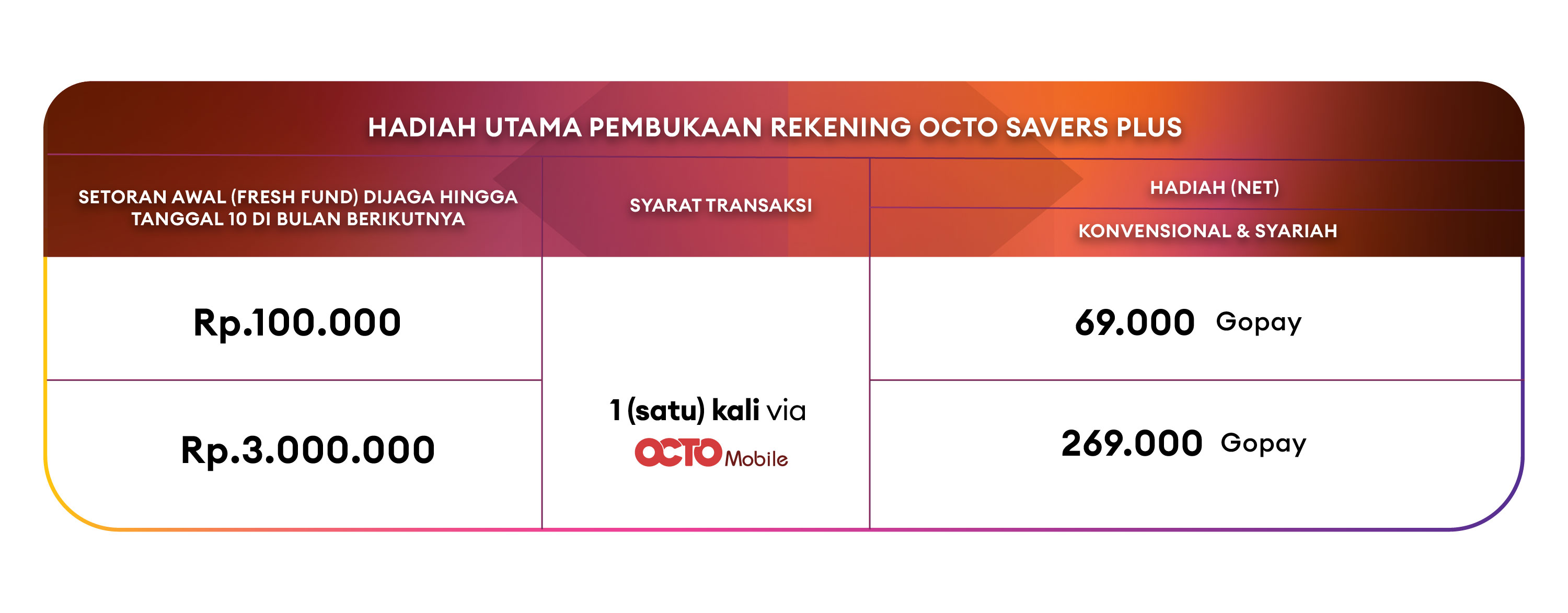 Berlaku untuk pembukaan rekening OCTO Savers Plus (konven/iB) atau OCTO Savers (konven/iB) dengan kondisi sebagai berikut: