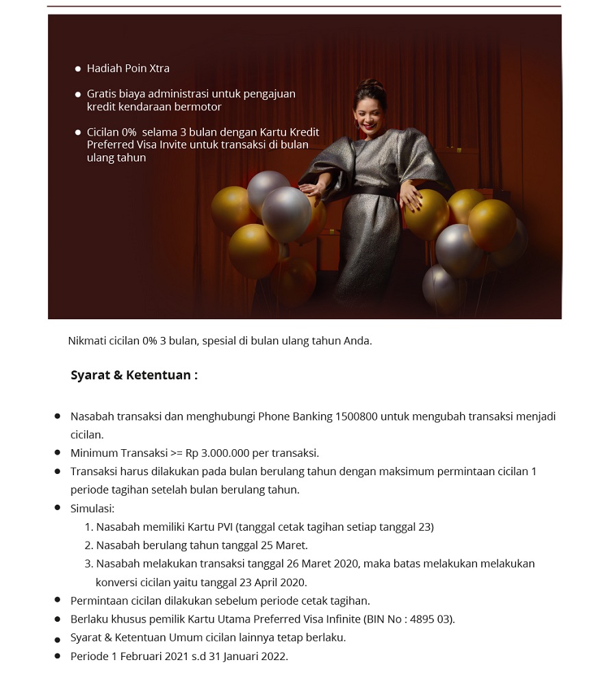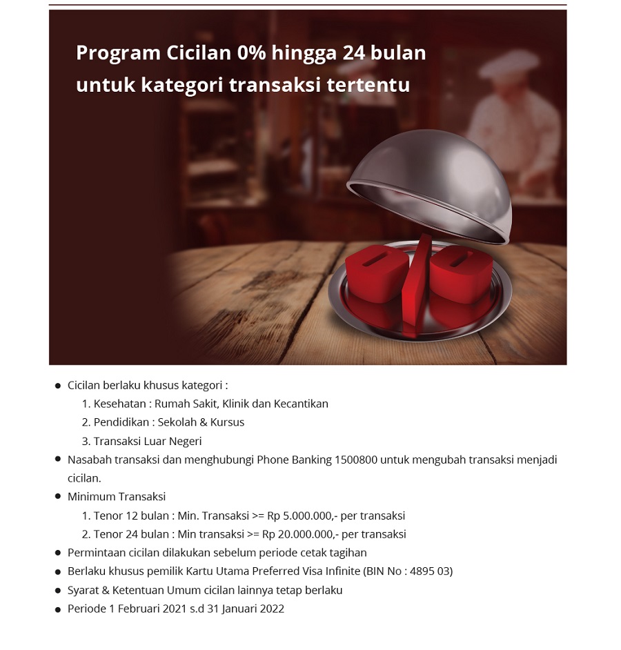 Transaksi ritel minimum Rp 500.000 dapat diubah menjadi cicilan tetap sebelum tanggal cetak tagihan dengan jangka waktu 3 s.d 36 bulan yang dapat dilakukan melalui
