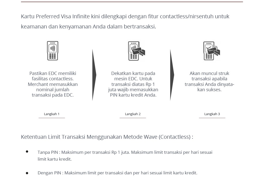 Pemegang Kartu Kredit Visa Preferred Infinite dapat menikmati fasilitas Bebas Biaya Airport Lounge untuk 1 orang (pemegang kartu) selama memiliki TRB (Total Relationship Balance) sebesar minimum Rp 500.000.000,- (lima ratus juta rupiah) dalam jangka waktu 3 (tiga) bulan berturut turut. Apabila TRB di bawah minimum selama 3 bulan, maka akan dikenakan biaya pemakaian fasilitas sesuai dengan tarif yang berlaku. Klik disini untuk Airport Lounge yang berpartisipasi