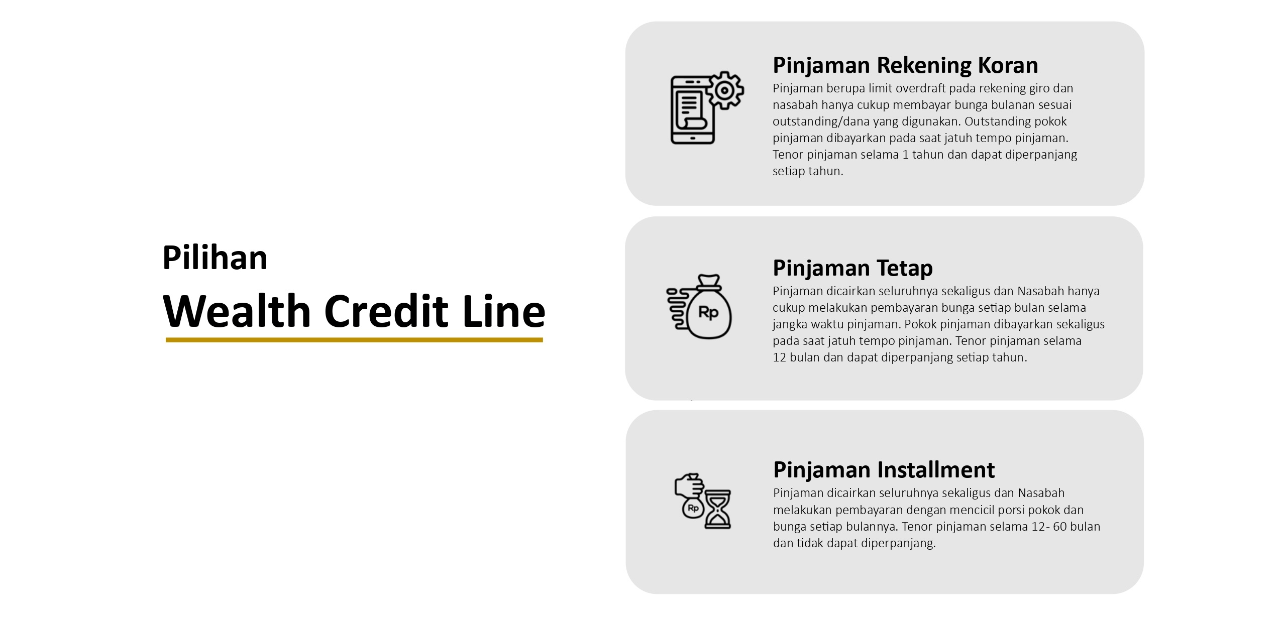 Manfaatkan portfolio investasi Anda sebagai jaminan fasilitas pinjaman untuk memenuhi berbagai kebutuhan finansial Anda melalui Wealth Credit Line