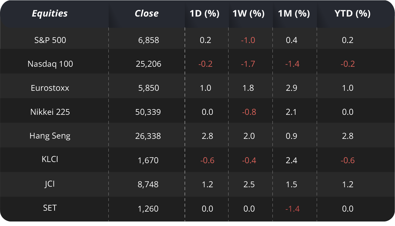 Kami juga mempertahankan outlook overweight untuk pasar saham Hong Kong/China dengan melihat gap valuasi antara Indeks Hang Seng Tech dan Nasdaq yang seharusnya menyempit seiring dengan kemajuan China dalam AI. Selain itu, China memiliki kapasitas energi yang cukup, yang merupakan keuntungan kompetitif yang signifikan. Target indeks Hang Seng untuk akhir 2026 di 30.100.
