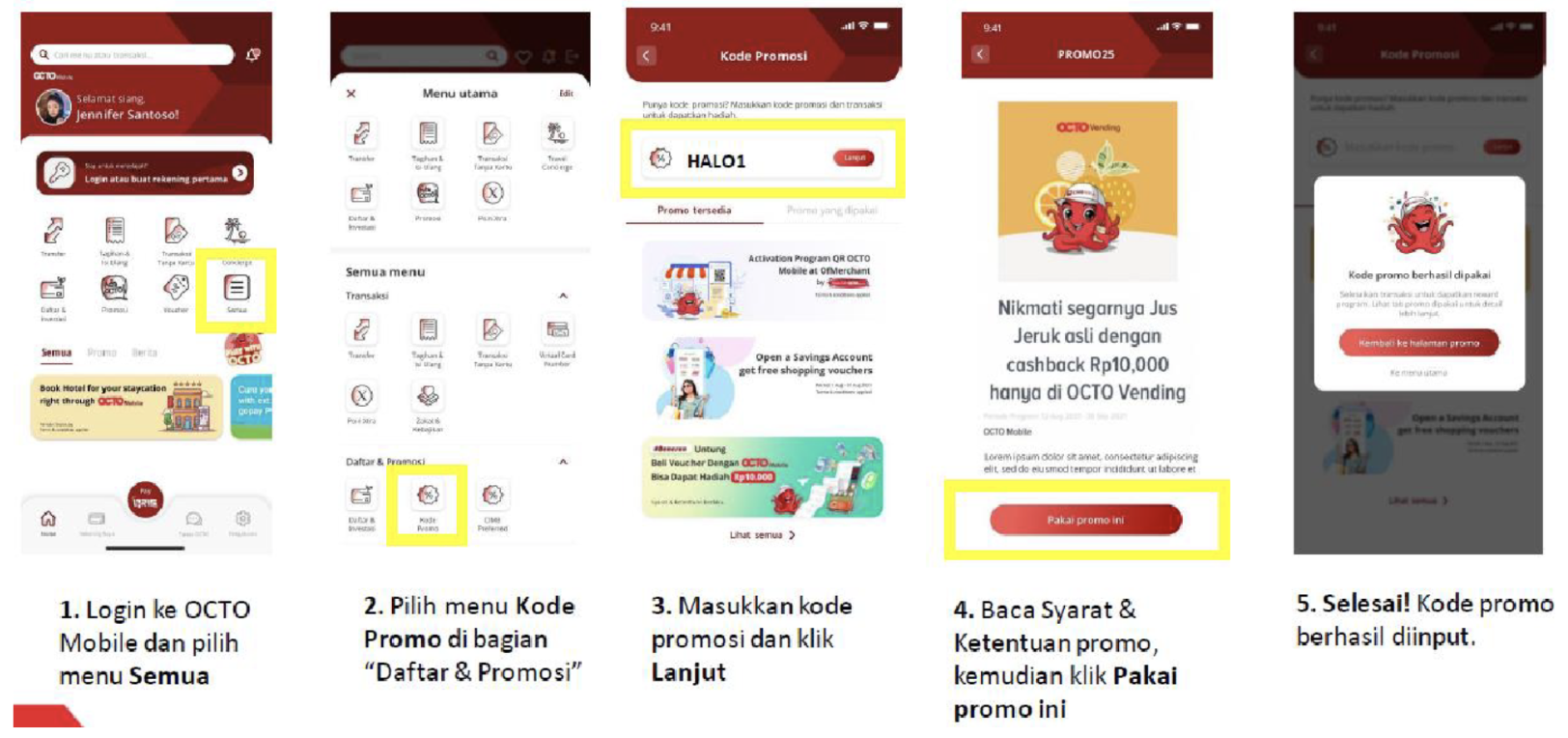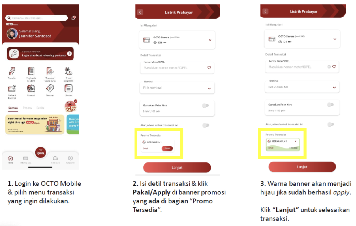 - Nasabah wajib menggunakan kode promo sebelum transaksi. Langkah – langkah menggunakan kode promo OCTO mengacu ke Lampiran 2.