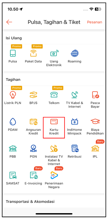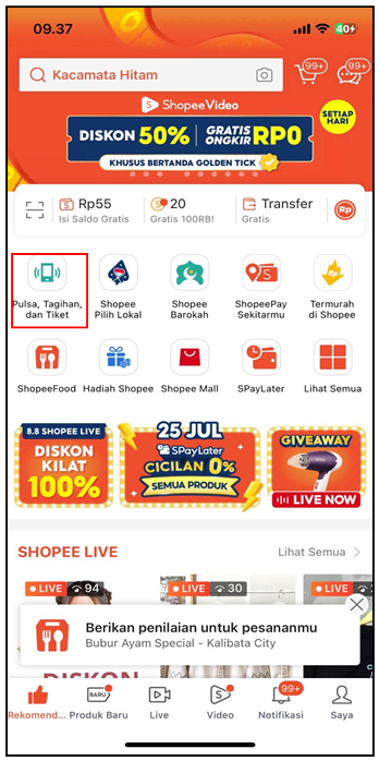 - Buka Aplikasi Shopee, pilih Menu “Pulsa, Tagihan, dan Tiket” pada homepage Shopee