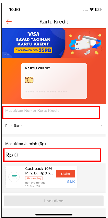 - Masukan Nomor Kartu Kredit VISA dan pilih “Bank CIMB Niaga” serta Masukan Jumlah Nominal yang ingin dibayarkan. Klik “Lanjutkan”