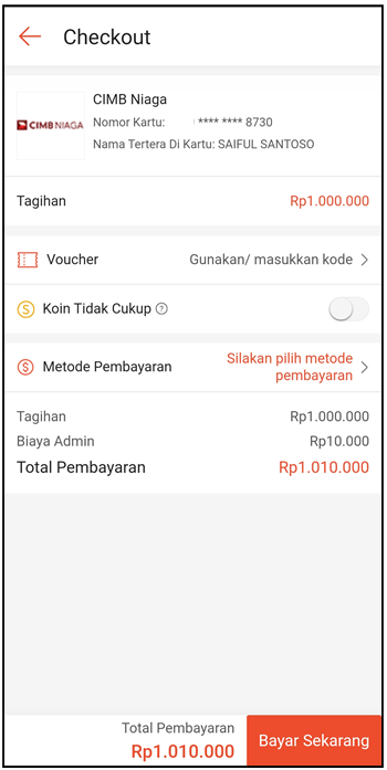 - Setiap data dan instruksi pembayaran yang dilakukan Nasabah menggunakan Card Bill Payment CIMB Niaga sepenuhnya merupakan tanggung jawab Nasabah.