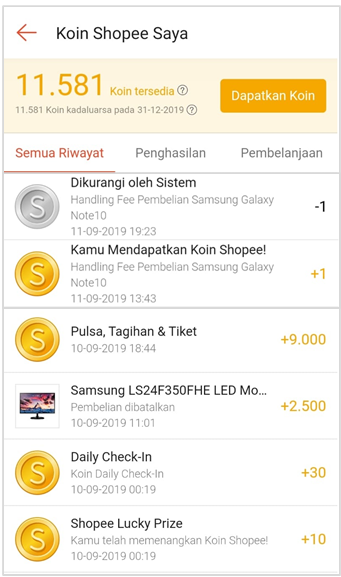 - History Coin dapat dilihat pada laman Koin Shopee Saya