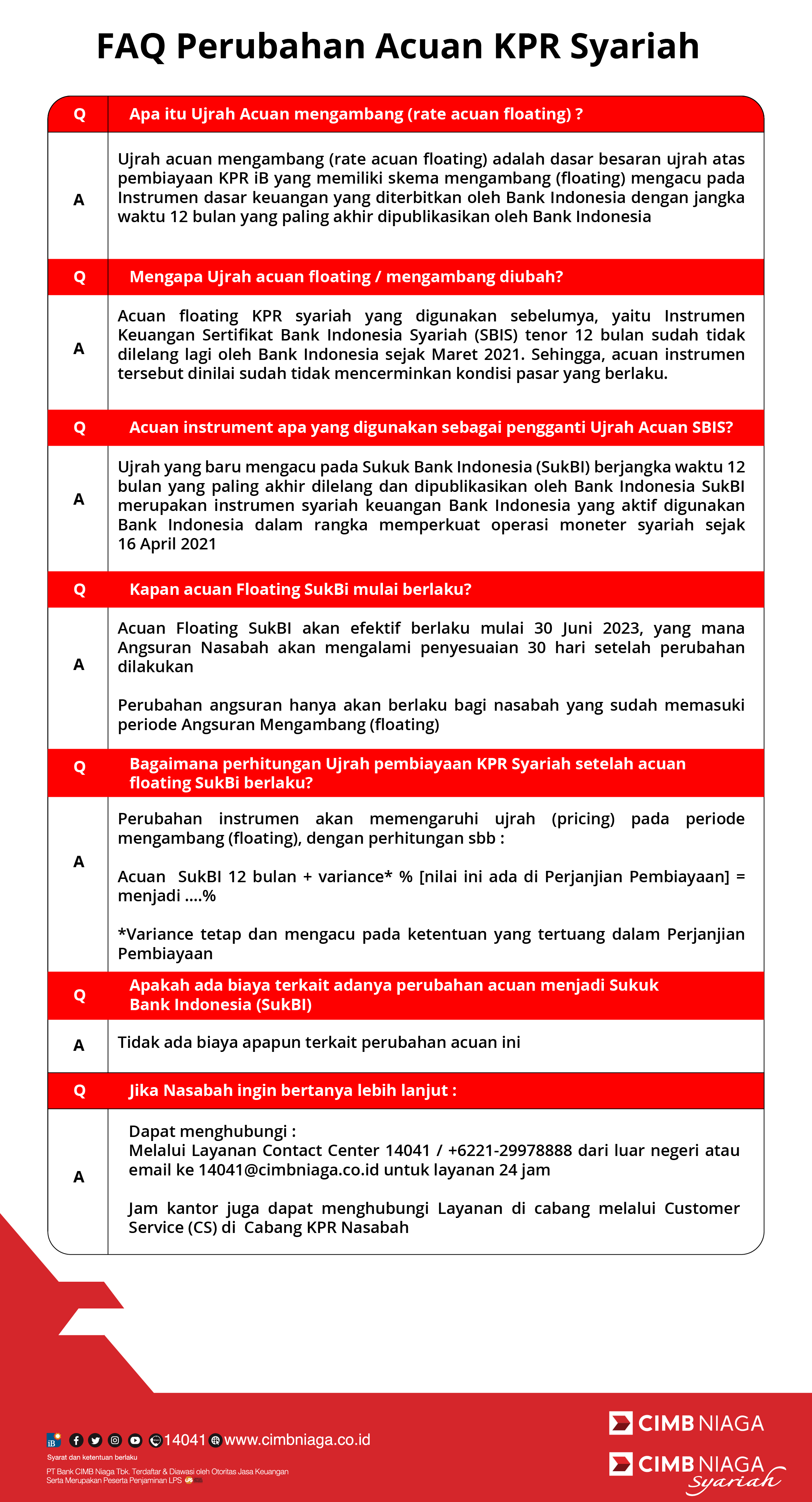Sehubungan dengan Instrument Sertifikat Bank Indonesia (SBI) atau Sertifikat Bank Indonesia Syariah (SBIS) berjangka waktu 12 bulan sudah tidak diumumkan atau dilelang oleh Bank Indonesia sejak Maret 2021, maka dengan ini kami sampaikan rujukan dasar perubahan Ujrah/Ujroh Floating Pembiayaan KPR iB CIMB Niaga. Penggunaan instrument SBI/SBIS berjangka waktu 12 bulan akan disesuaikan menjadi instrument: Sukuk Bank Indonesia (SukBI) berjangka waktu 12 bulan yang terakhir dilelang Bank Indonesia.